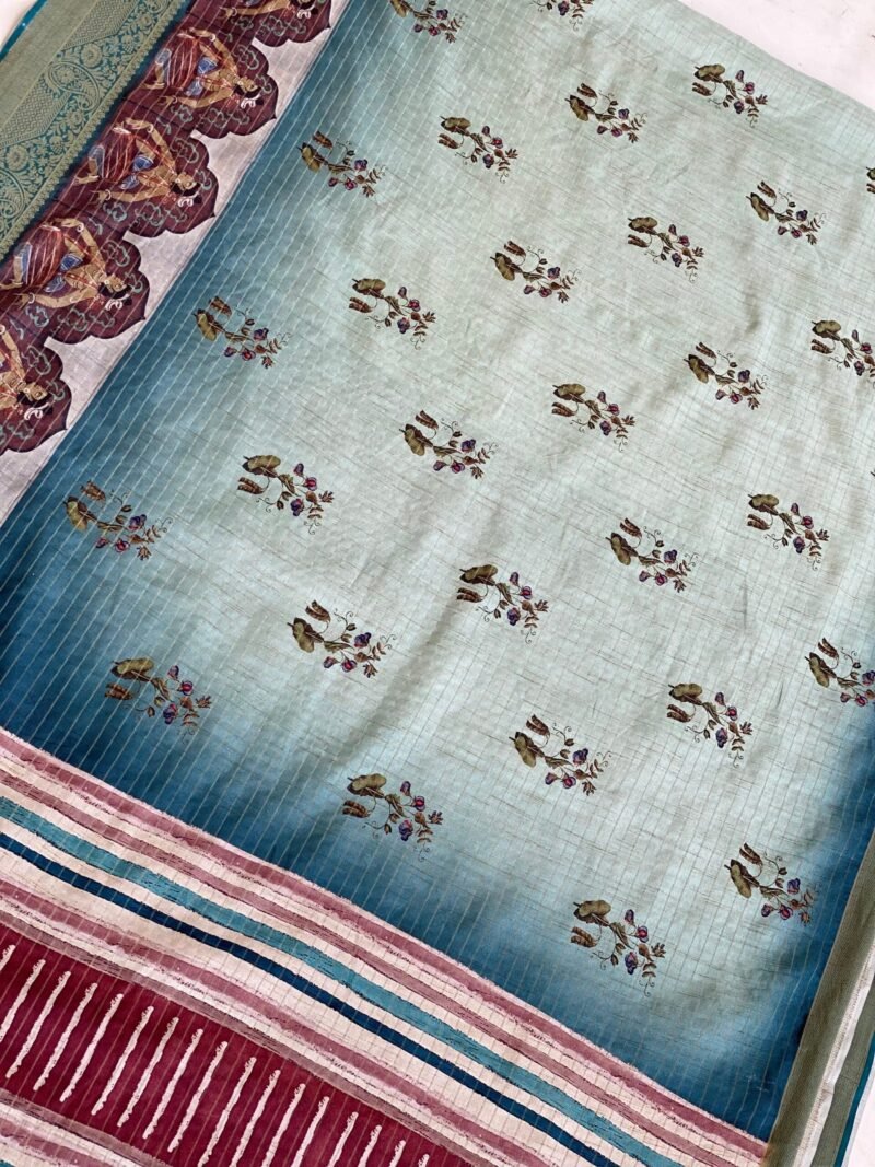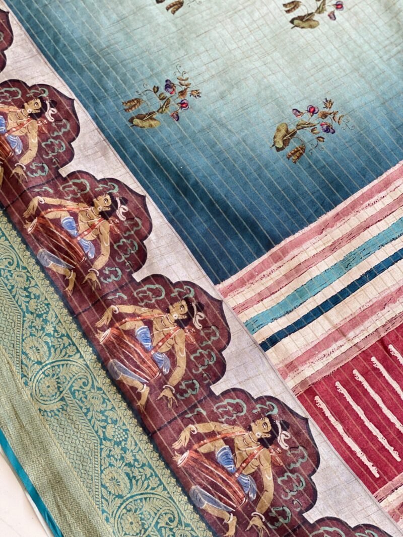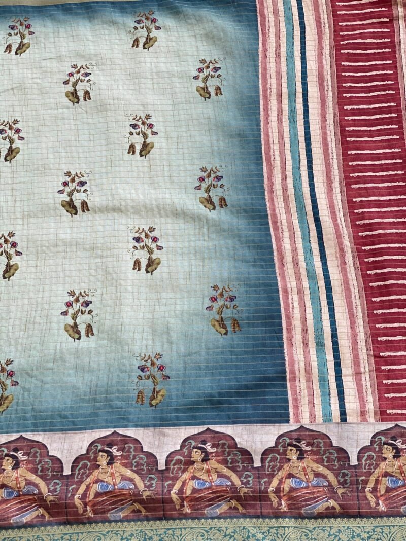 This Semi-Tussar silk saree beautifully blends tradition and modernity. The saree features unique human figure motifs paired with striking geometric patterns on the body, creating a captivating design. The zari border with checks adds a touch of elegance, making it perfect for festive events or cultural gatherings. The fabric is soft, easy to drape, not transparent, and offers a graceful fall, ensuring comfort throughout the day.