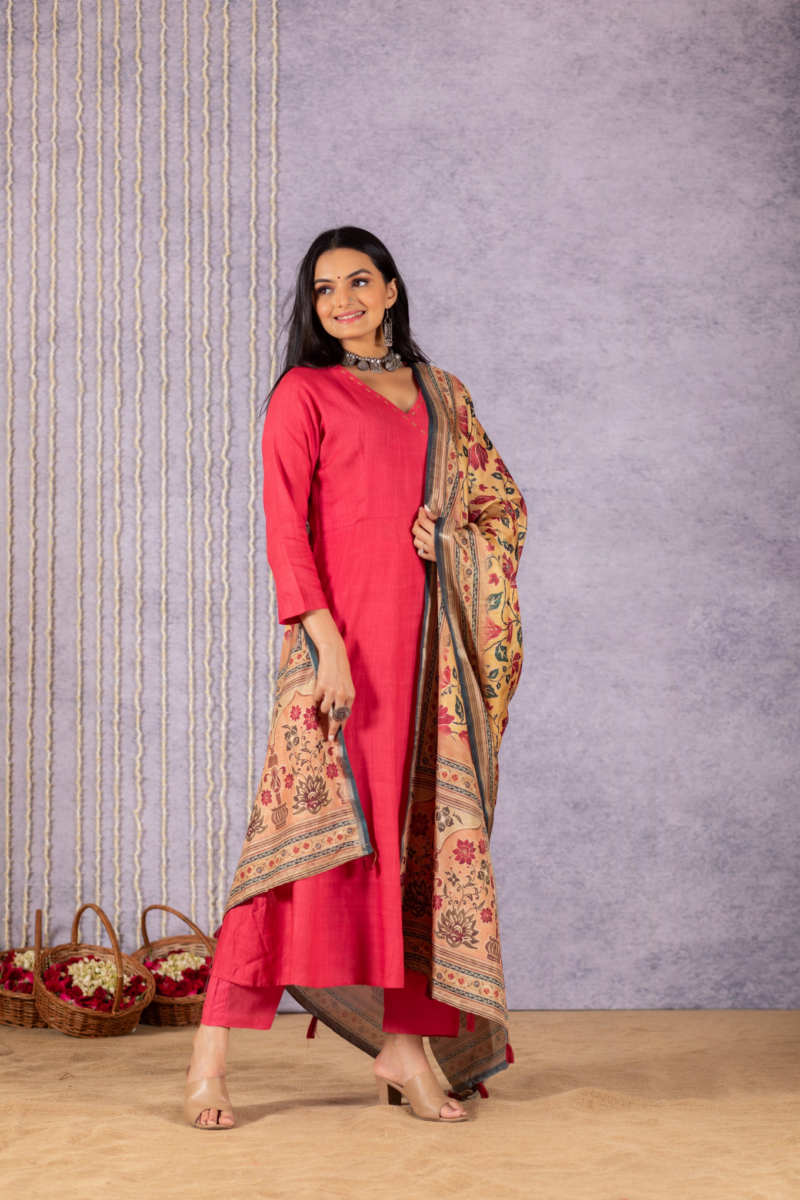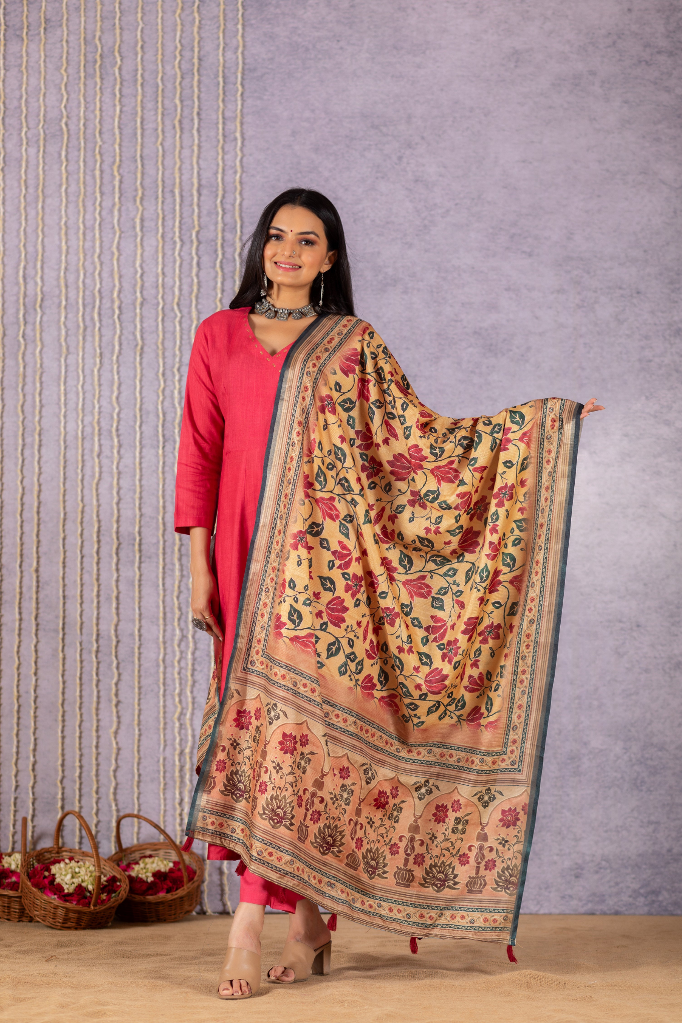 This gorgeous digitally printed dupatta Will be a perfect addition to your ethnic collection. The kalamkari print adds to the beauty of this concept. Flowers gracing the border of the dupatta, like nature’s delicate touch. This dupatta is trendy yet a classic addition to your wardrobe.