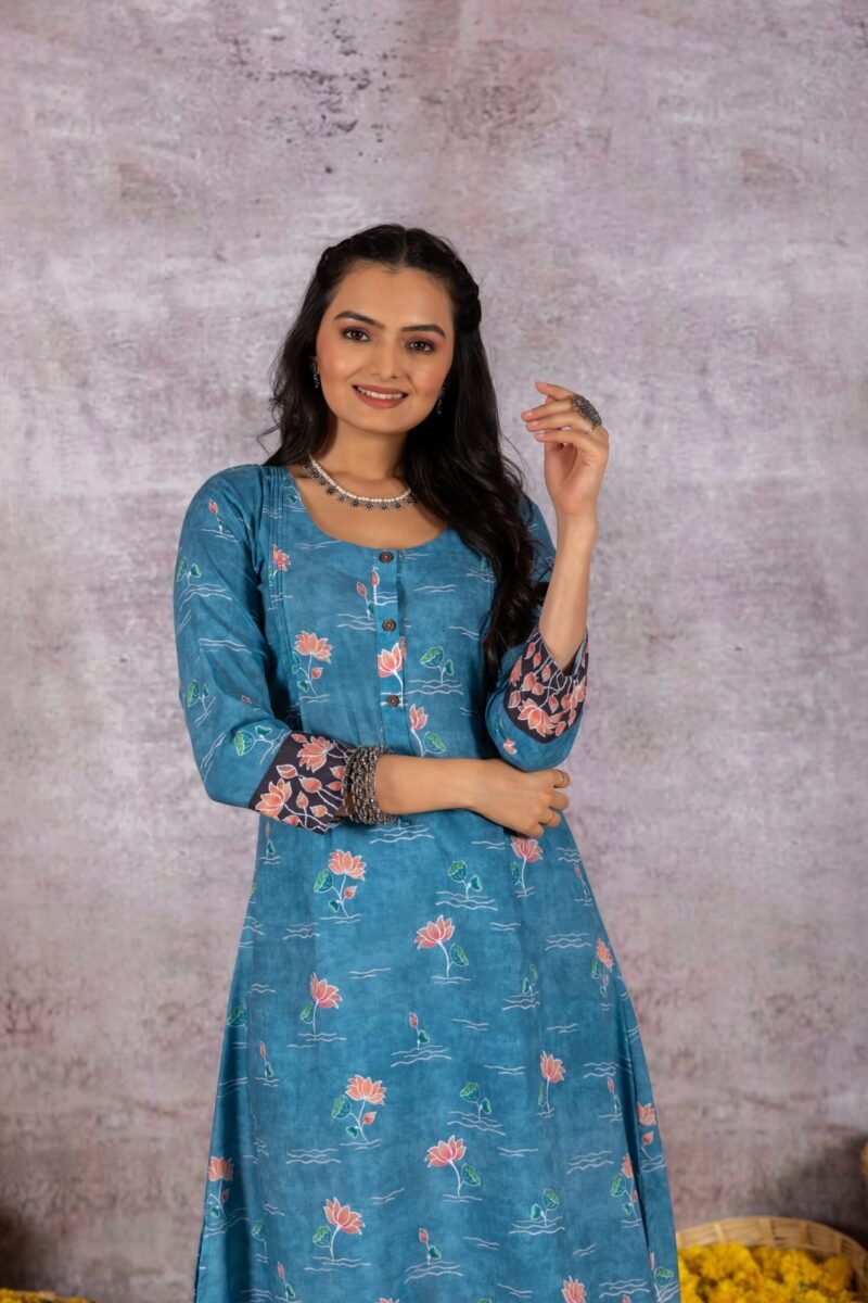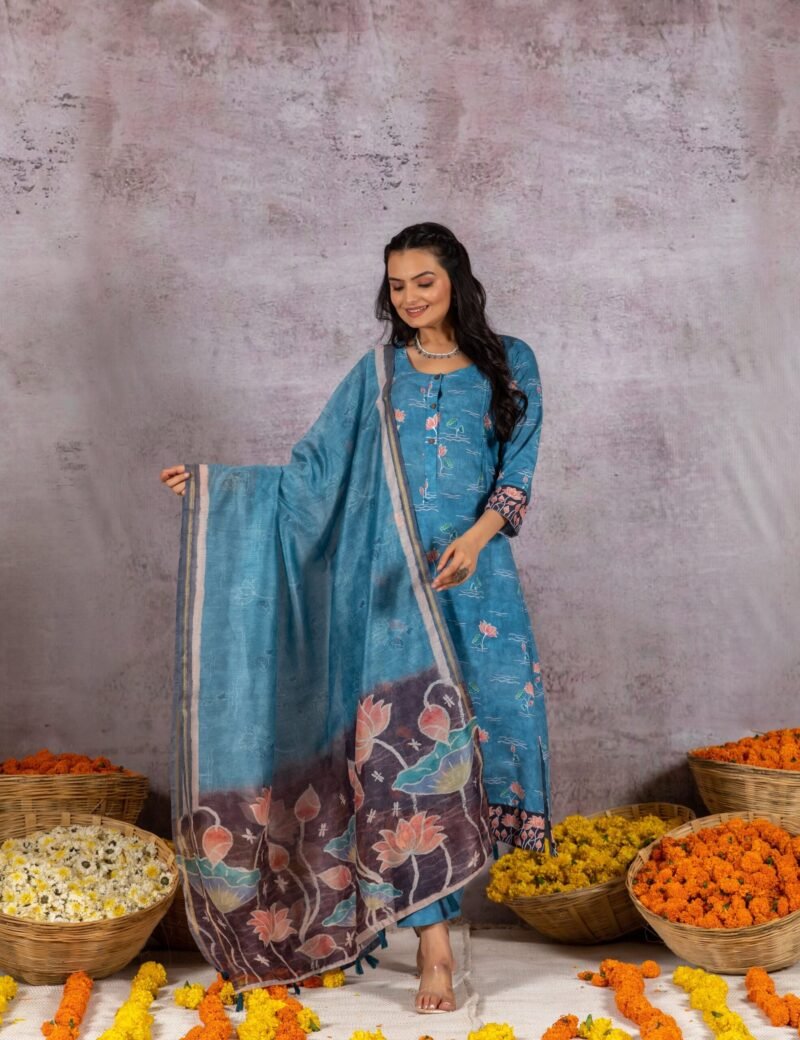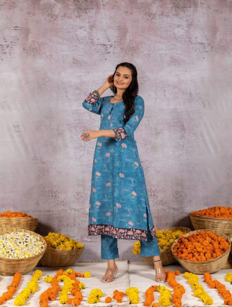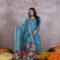 This gorgeous blue suit set is an eye-catcher. It is a soft cotton kurta and pants with pichwai prints.