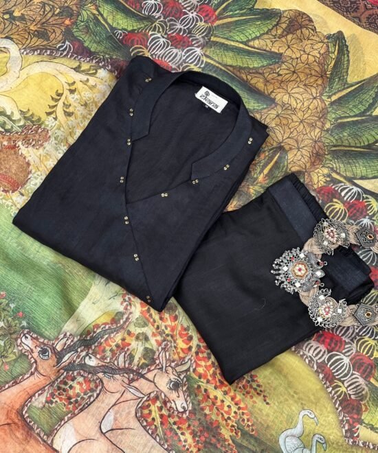 Elegant Black Bird V-Neck Kurta Set with Stylish Collar