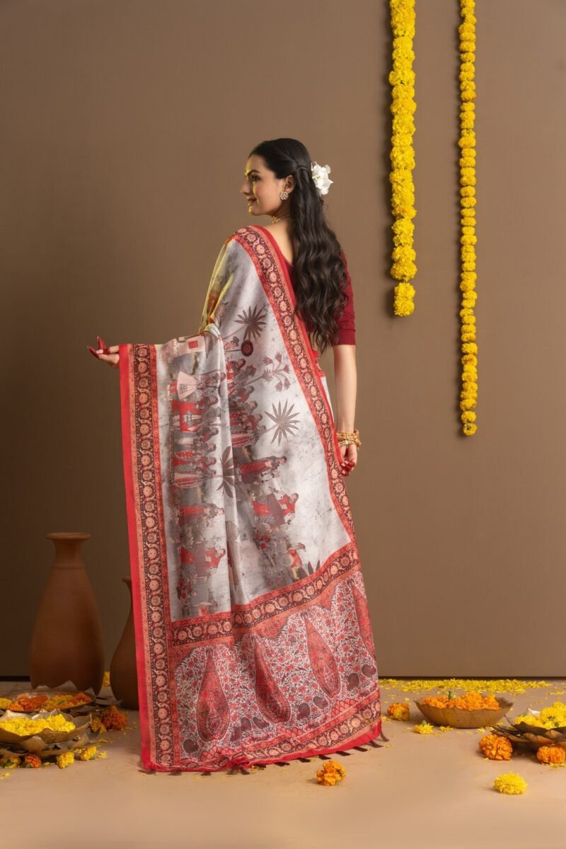 Celebrate the spirit of Durga Puja with our beautiful Shubho Pujo Series Sarees, perfect for the festive season. These ethnic sarees feature intricate designs of small deer, trees, and figures woven into the fabric, bringing a touch of nature and tradition to your look. The classic red and white colors, popular during Durga Puja, add a festive vibe. Some sarees also showcase lovely paisley prints on the pallu and eye-catching ikkat borders, combining elegance with a traditional touch. Perfect for adding a special, festive charm to your wardrobe, these luxury sarees embody the essence of Indian ethnic wear. Discover the exclusive creations from Ekana Label. Each saree comes with an unstitched blouse, making it a stunning choice for this season’s celebrations.