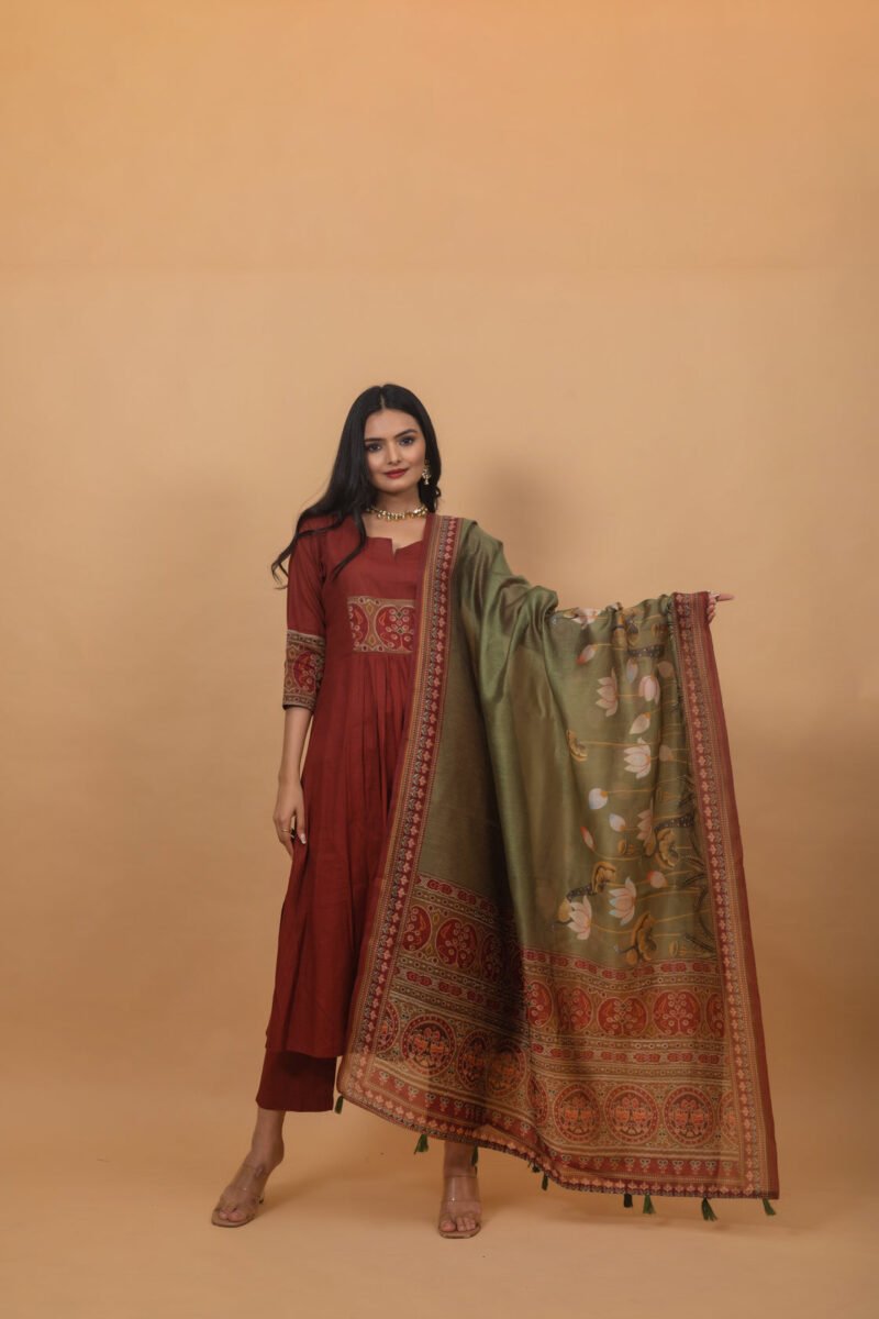 This gorgeous digitally printed dupatta Will be a perfect addition to your ethnic collection. The Pichwai print adds to the beauty of this concept. This dupatta is trendy yet a classic addition to your wardrobe.