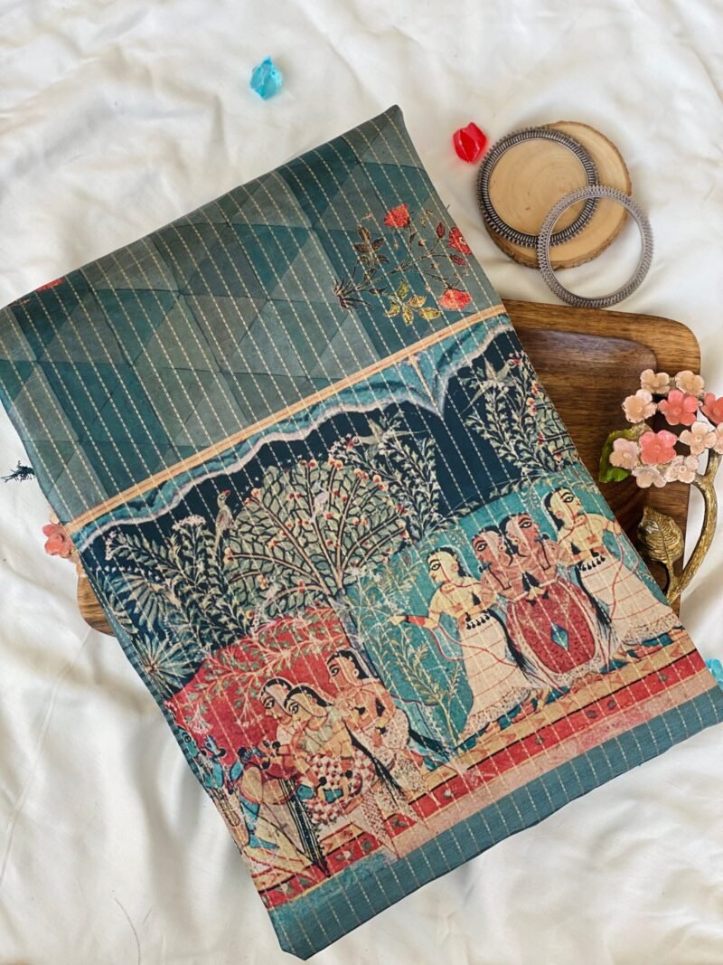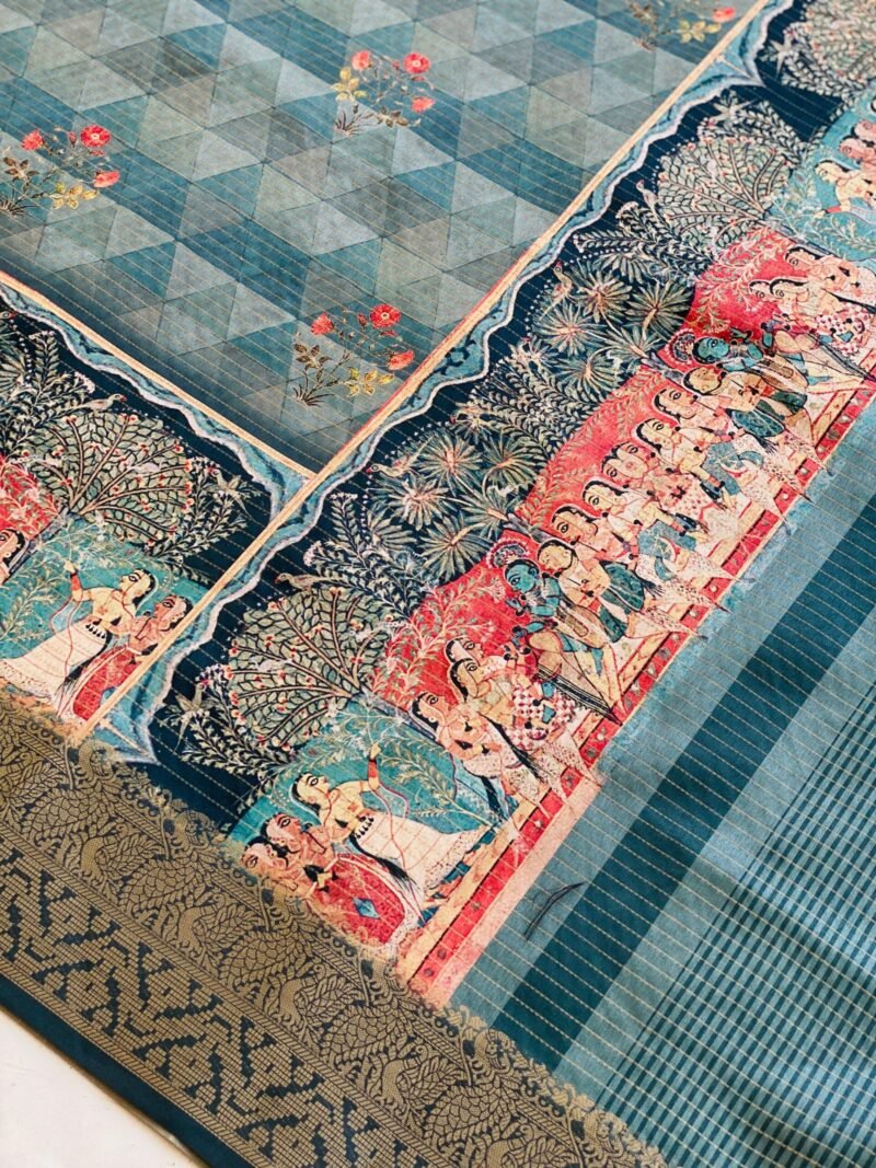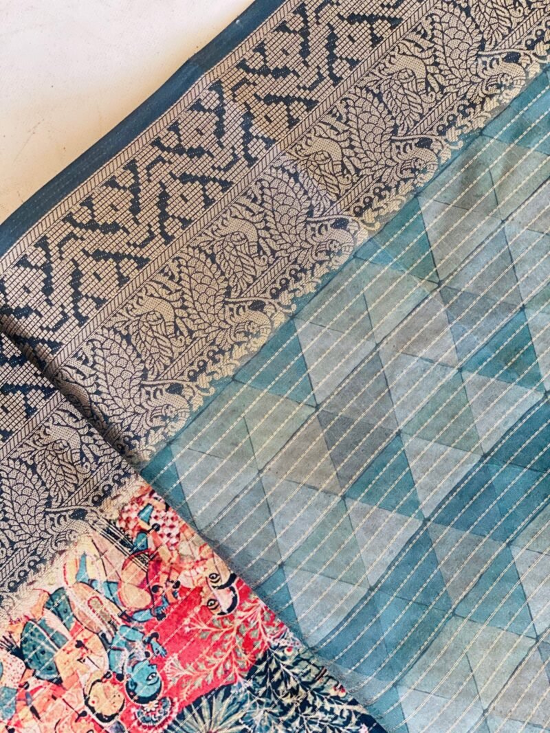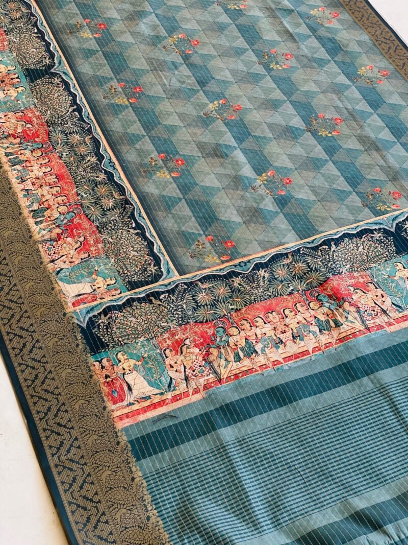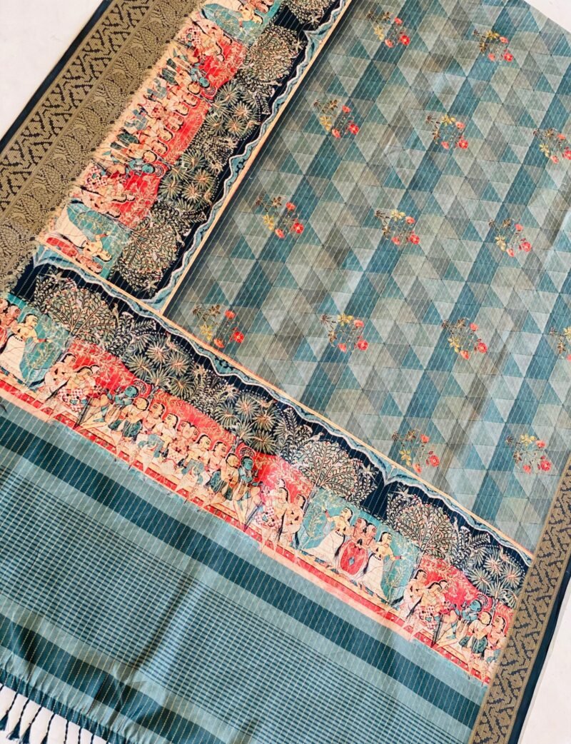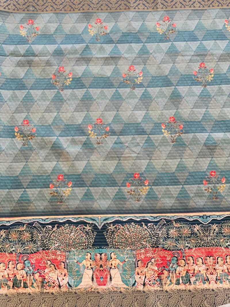 Add a touch of elegance to your wardrobe with this beautiful Semi-Tussar Silk Saree featuring a unique geometric print on the body. The saree is highlighted by a stunning Pichwai-inspired teal blue pallu adorned with a charming checks print. The intricate zari border further enhances its regal appeal, giving it a sophisticated and traditional finish. The fabric is soft, breathable, and easy to drape, ensuring comfort and a graceful fall. Whether for festive celebrations or special occasions, this saree offers the perfect blend of modern design and timeless craftsmanship.
