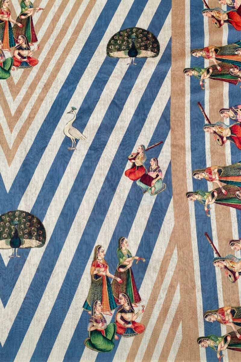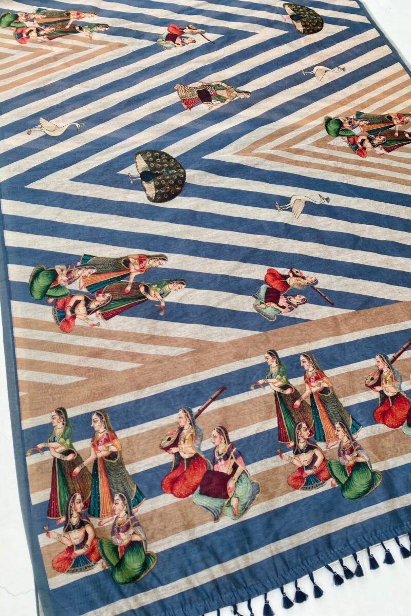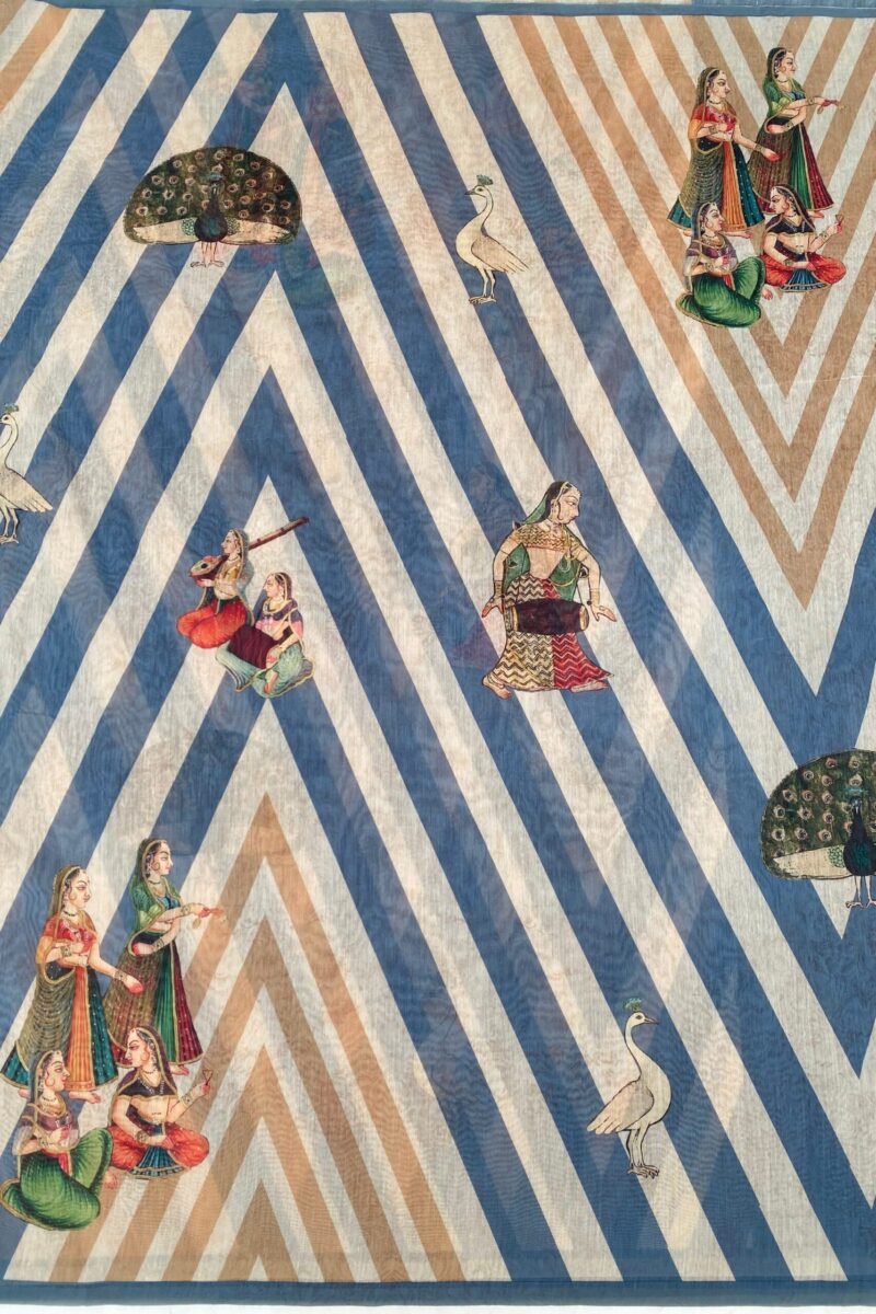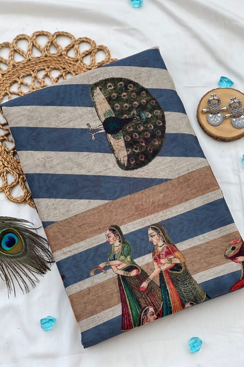 Discover our beautiful blue stripe print saree! It features a lovely design with a lady sitting with her friend, with a beautiful peacock in the background. The saree comes with an unstitched polka dot print blouse.