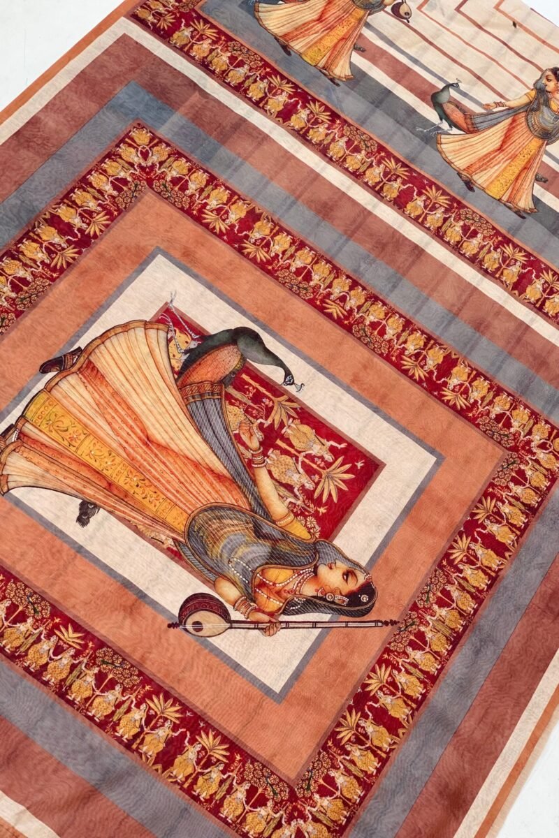 The body of the saree features a striking striped print, adding a modern touch to this timeless piece. The pallu showcases an exquisite artwork of a graceful lady playing the sitar, accompanied by a beautifully detailed peacock, symbolizing beauty and harmony.