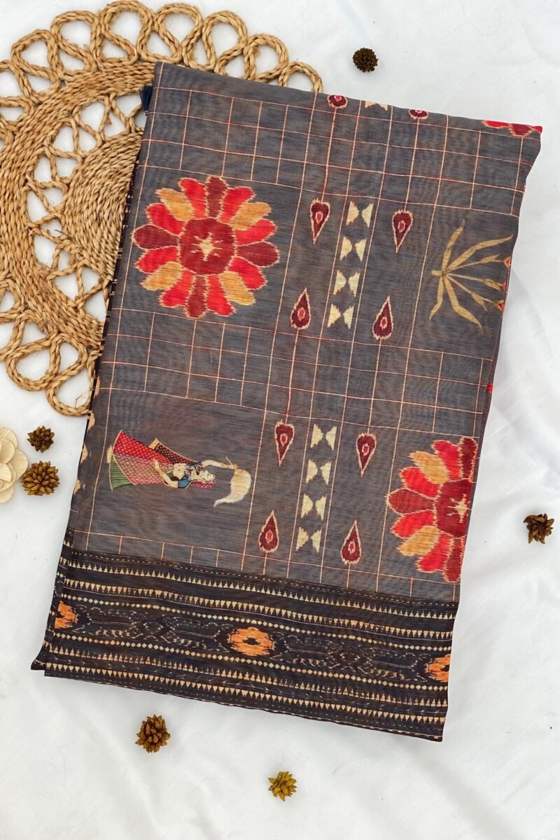 Discover the elegance of our latest Chanderi cotton sarees, now featuring exquisite figure prints in a vibrant grey hue. Each saree is adorned with a stunning pallu crafted in intricate ikkat prints.