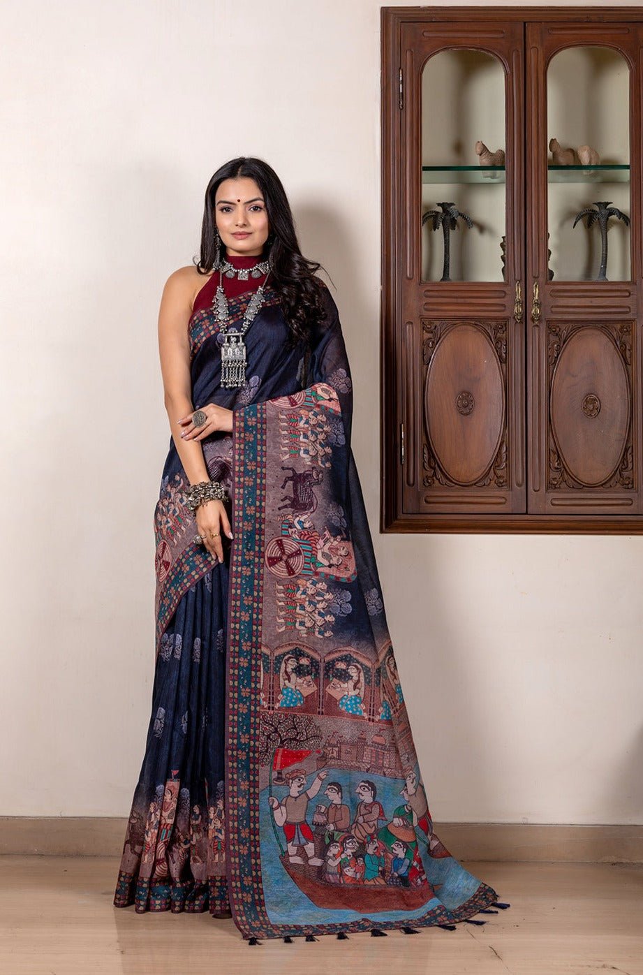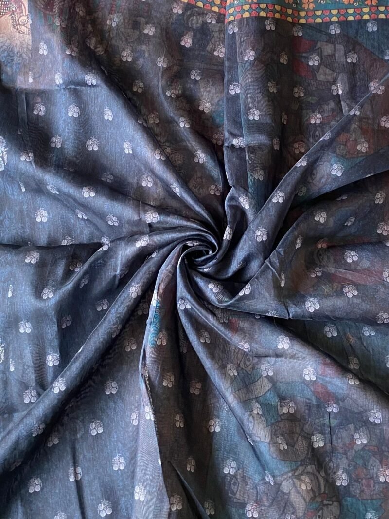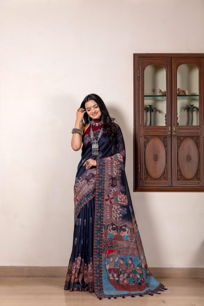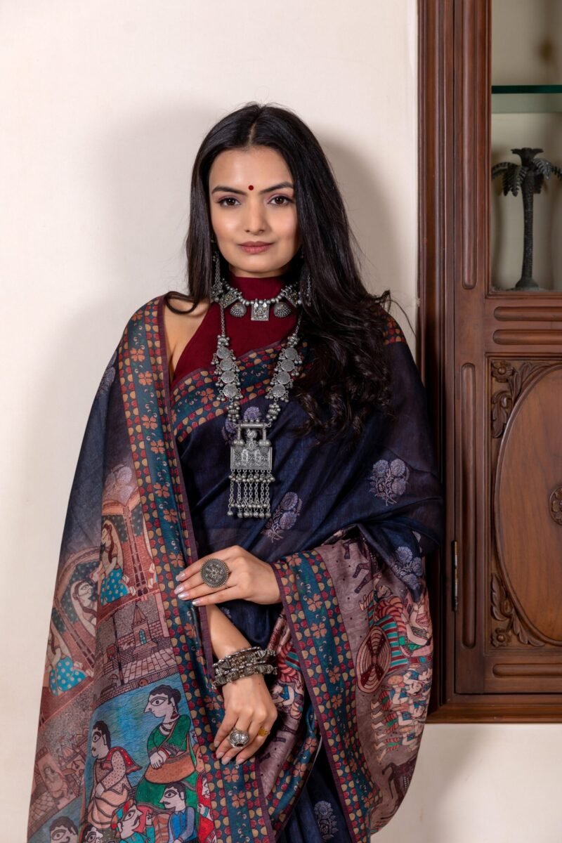 This gorgeous Madhubani saree with traditional kalamkari print is a perfect blend of Indian ethnicity and modernity. Saree comes with contrast an unstitched blouse. The madhubani on pallu of the saree adds to the beauty of concept.