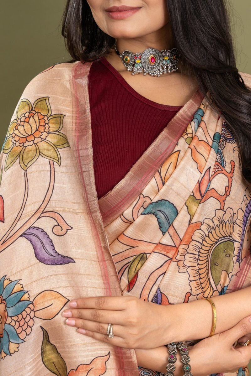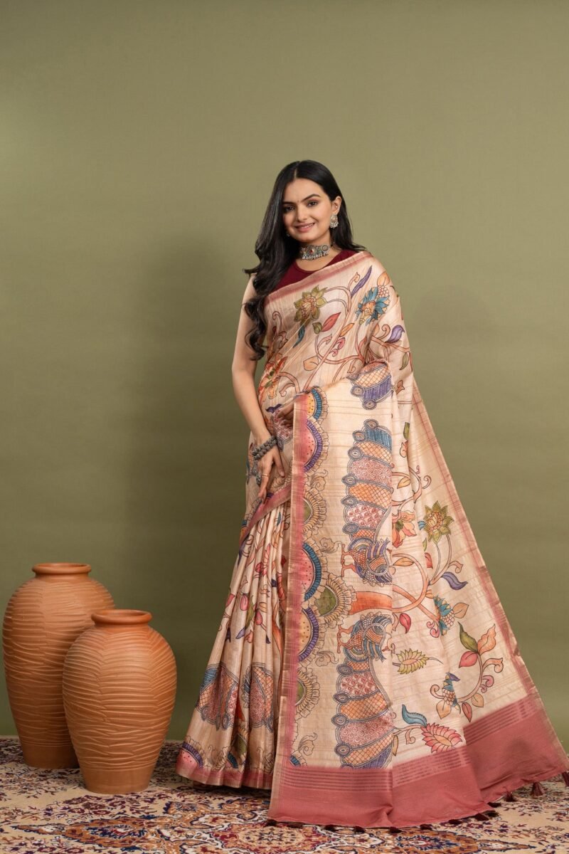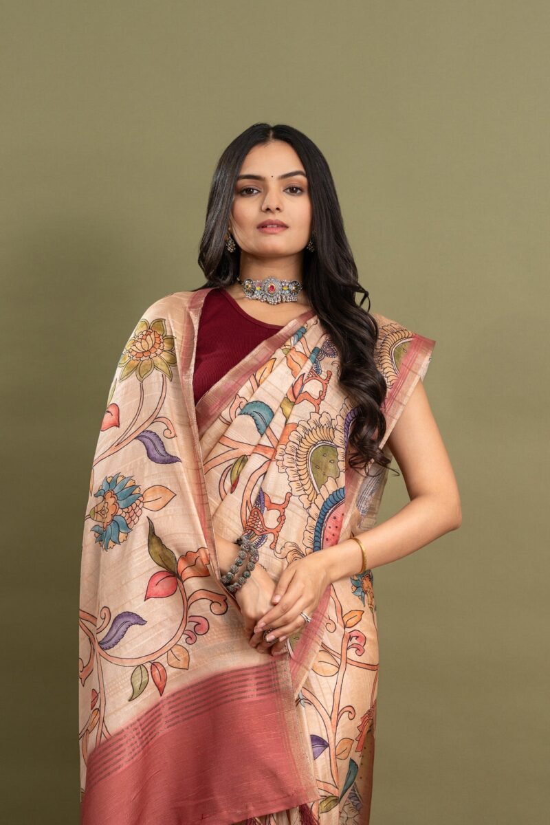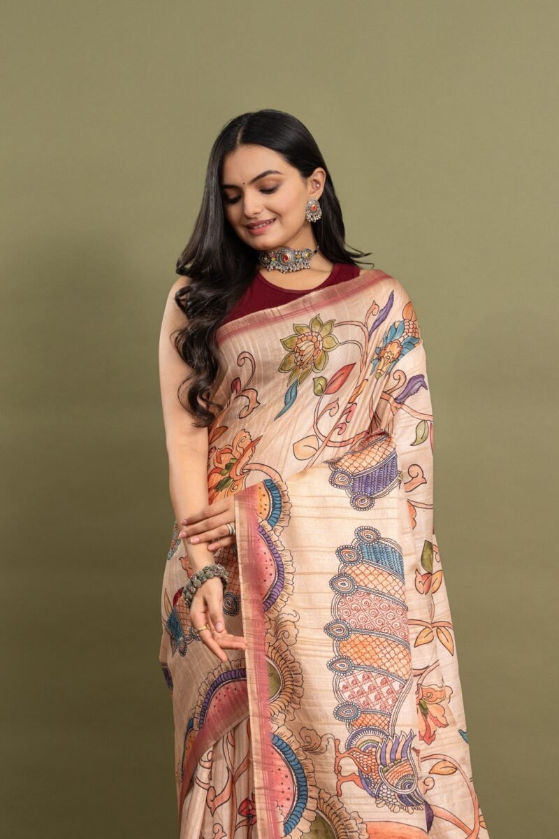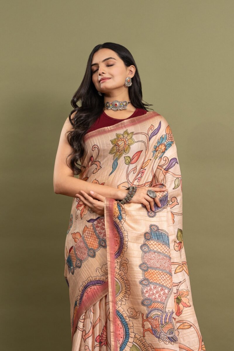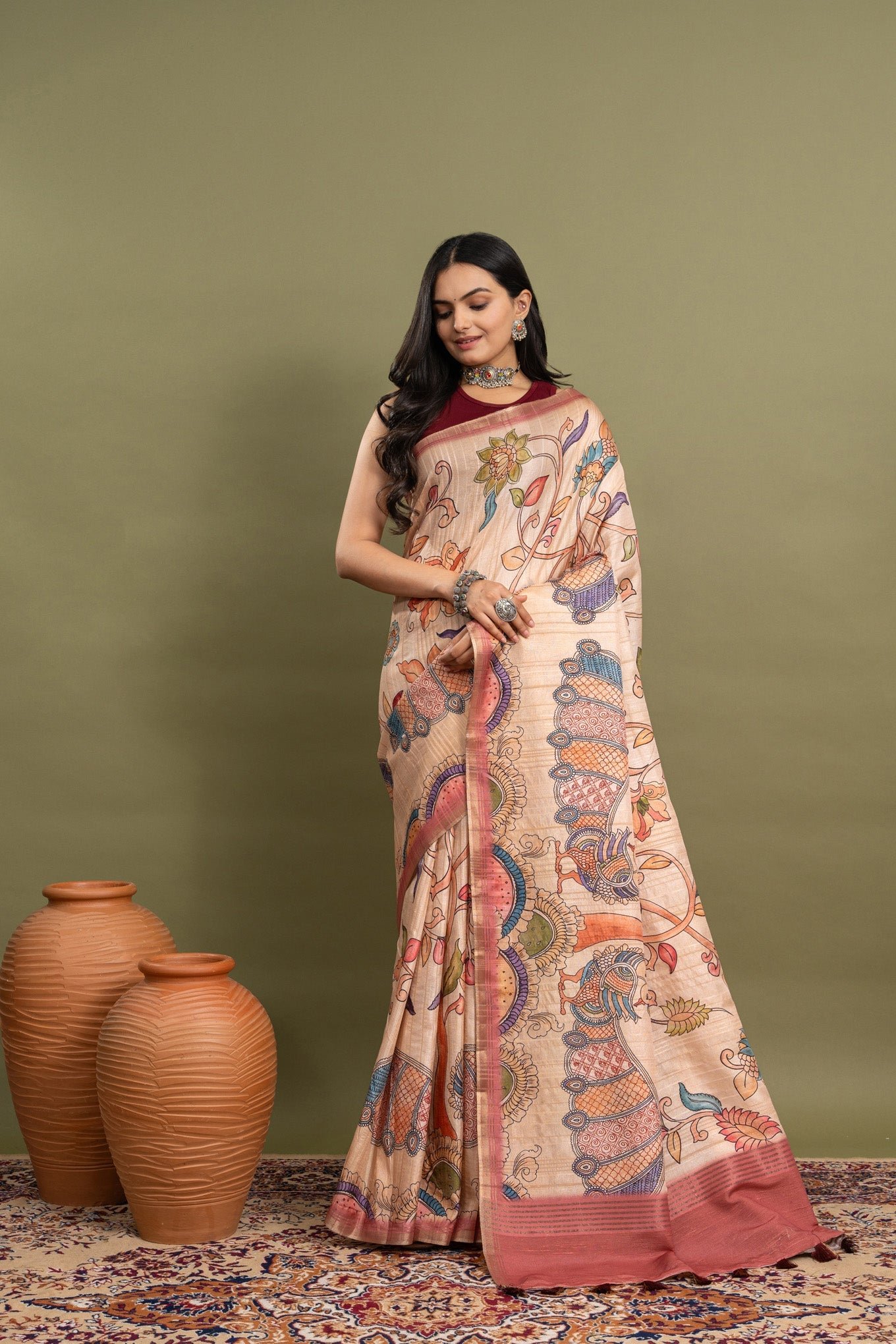 Embrace the beauty of traditional art with this elegant beige saree, adorned with exquisite Kalamkari and peacock prints. The saree features detailed Kalamkari designs that celebrate heritage art, while the peacock motifs add a graceful touch, symbolizing elegance and beauty. Perfect for cultural gatherings, festive occasions, and formal events, this saree is crafted from comfortable, high-quality fabric that drapes beautifully, giving you an effortlessly stylish look rooted in tradition.