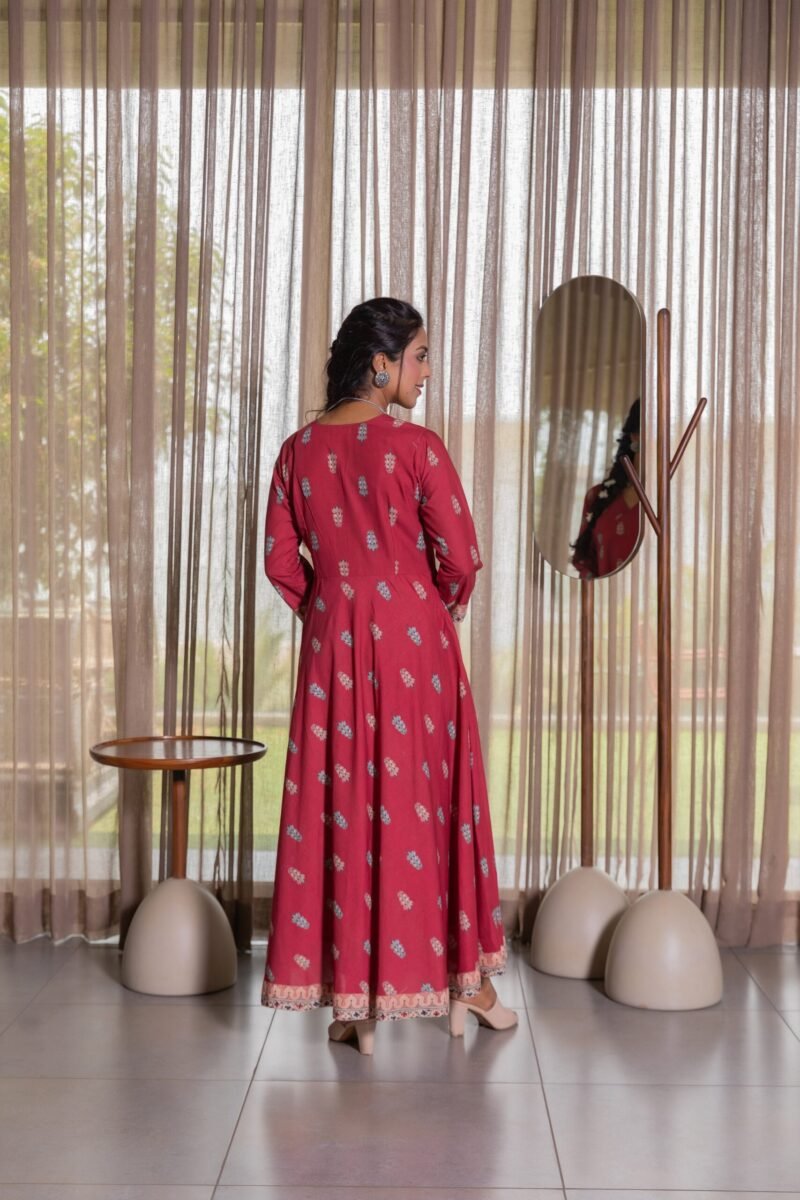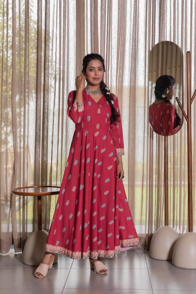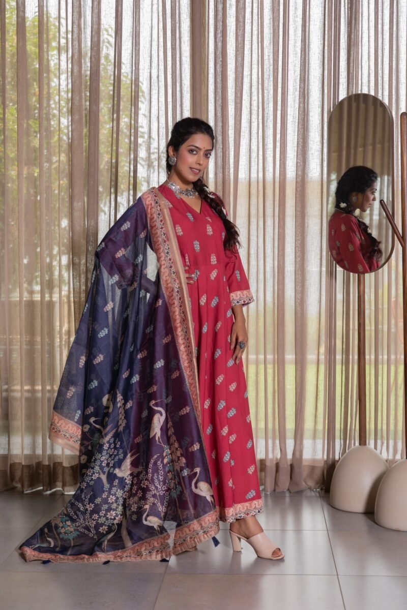 The Soft Cambric Cotton Angrakha Style Gown, a blend of elegance and comfort that’s set to elevate your wardrobe. Paired with a striking blue dupatta featuring a delicate swan print, this ensemble exudes timeless beauty and cultural finesse