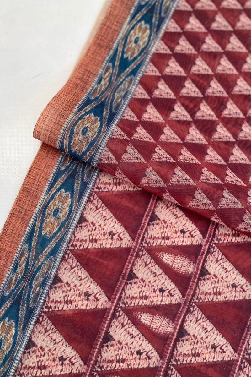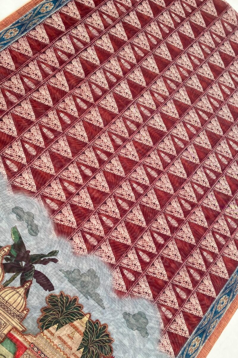 Introducing our latest saree marvel! Picture this: a blend of geometric and pichwai prints in mesmerizing shades of red. The body showcases the intricate geometric design, while the pallu exudes the rich charm of a pichwai. Plus, it comes with an unstitched blouse for your personal touch. Elevate your style effortlessly with this stunning ensemble!