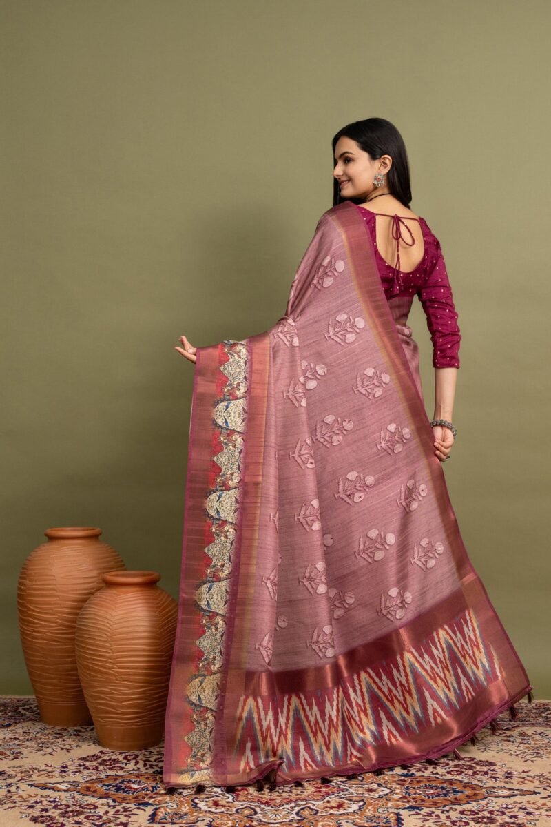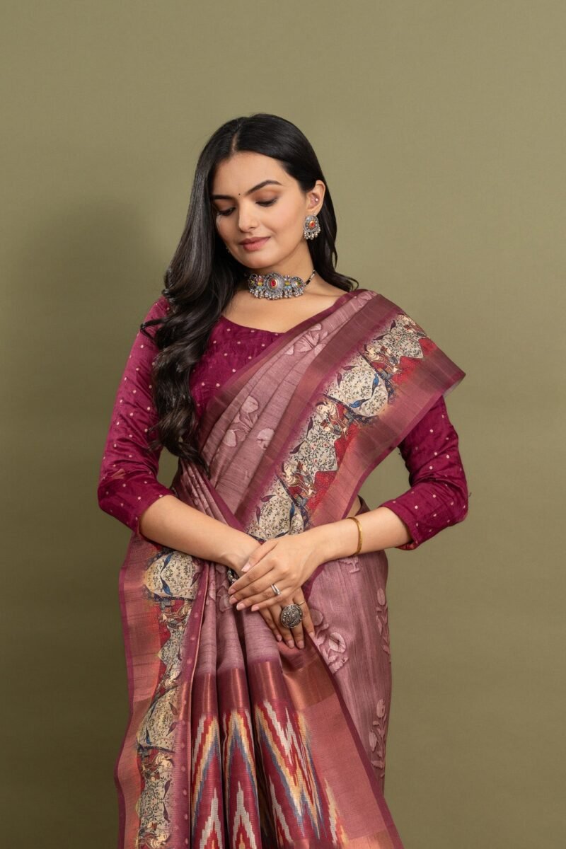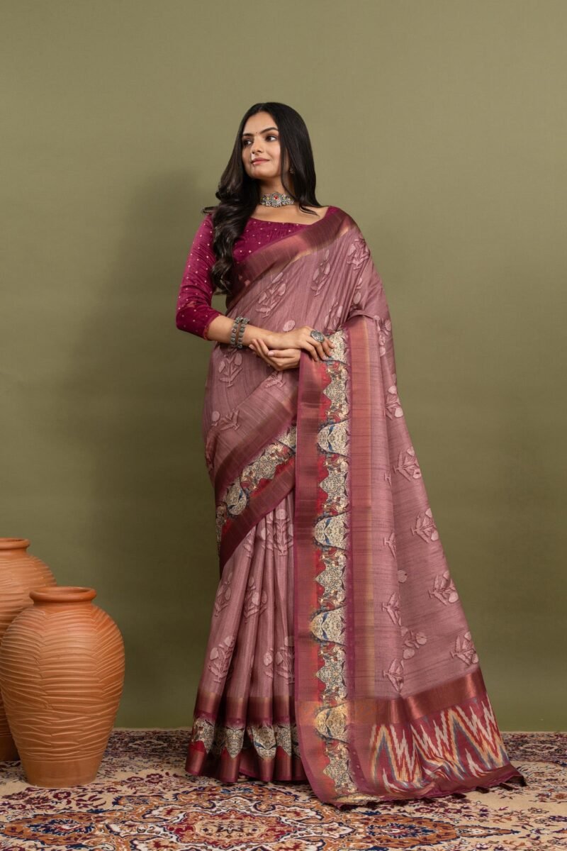 Add a touch of serenity and elegance to your wardrobe with this beautiful soothing pink saree, featuring delicate floral prints on the body. The soft pink hue brings out the subtle charm of the floral design, while the striking Ikat pallu adds a bold, traditional twist. Perfect for weddings, festive occasions, and cultural events, this saree is crafted from high-quality fabric that ensures both comfort and grace. Its blend of contemporary floral prints and timeless Ikat weaving makes it an ideal choice for those who love classic designs with a modern touch.