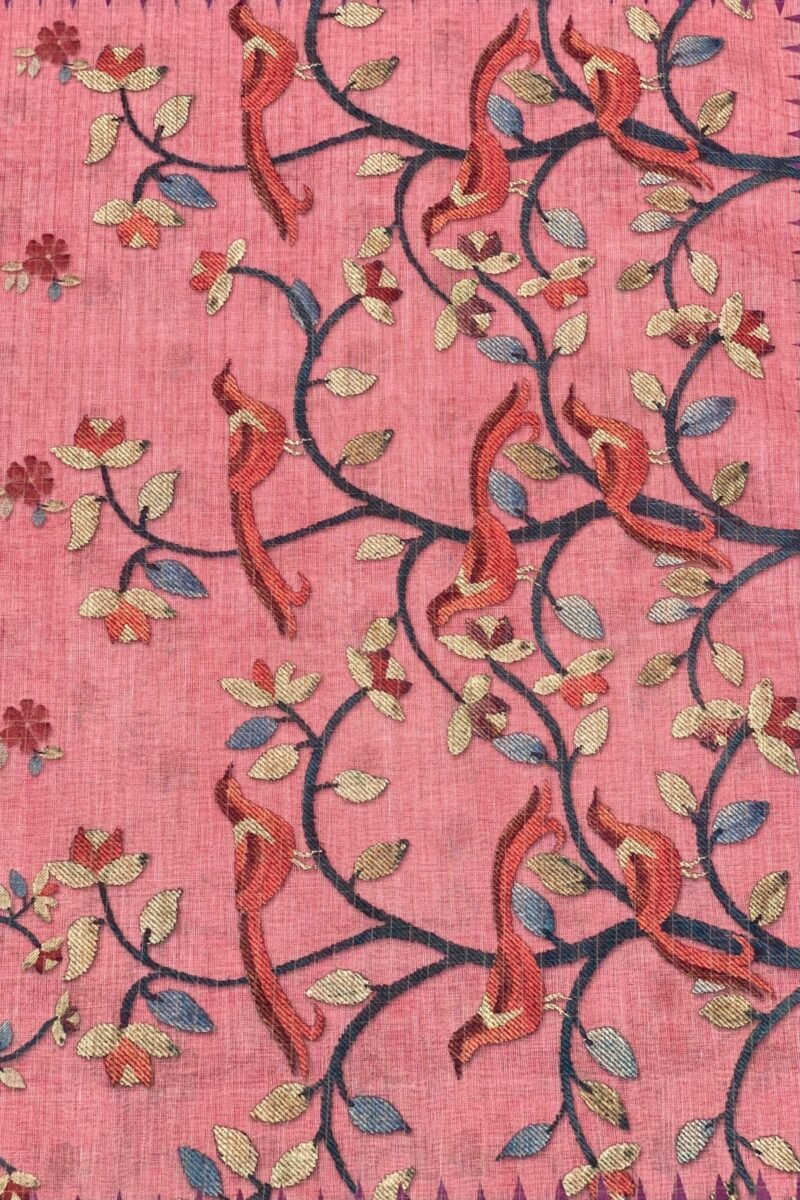 Check out our beautiful Linen Saree, a perfect blend of tradition and modern style. It has a checks zari print, bird-print pallu, and comes with an unstitched blouse. The soft fabric is lightweight and easy to drape.