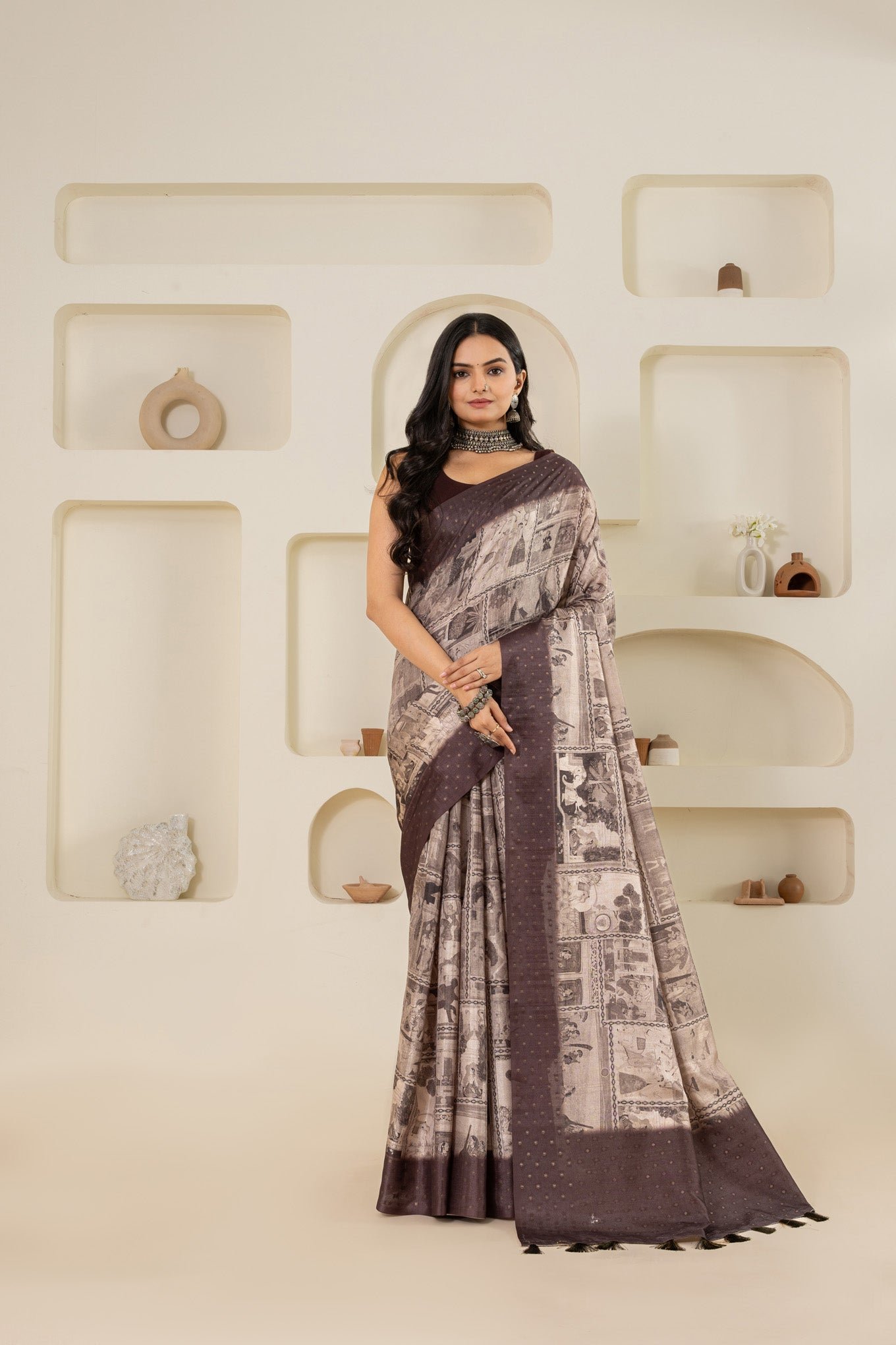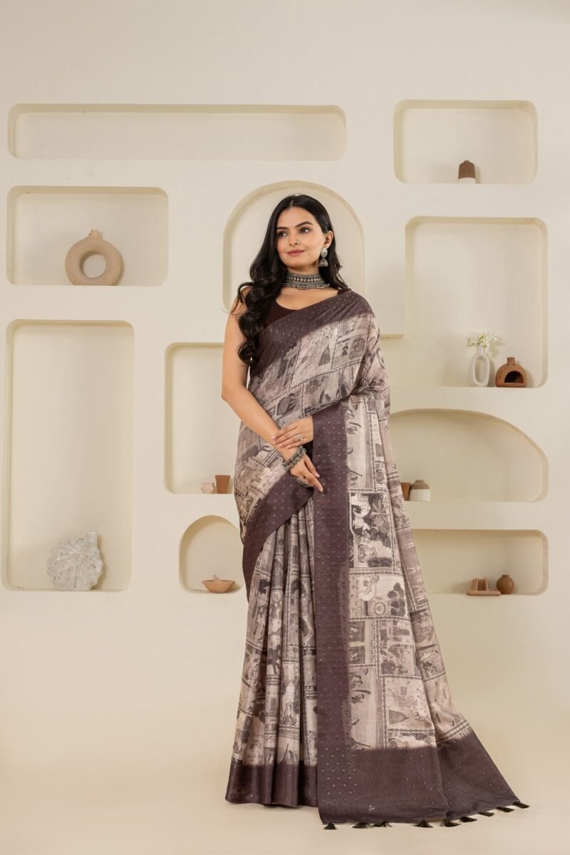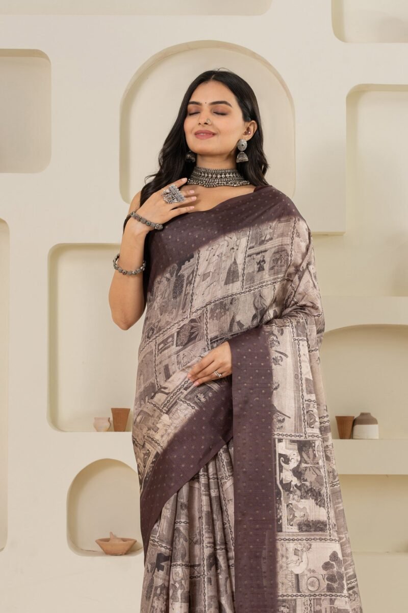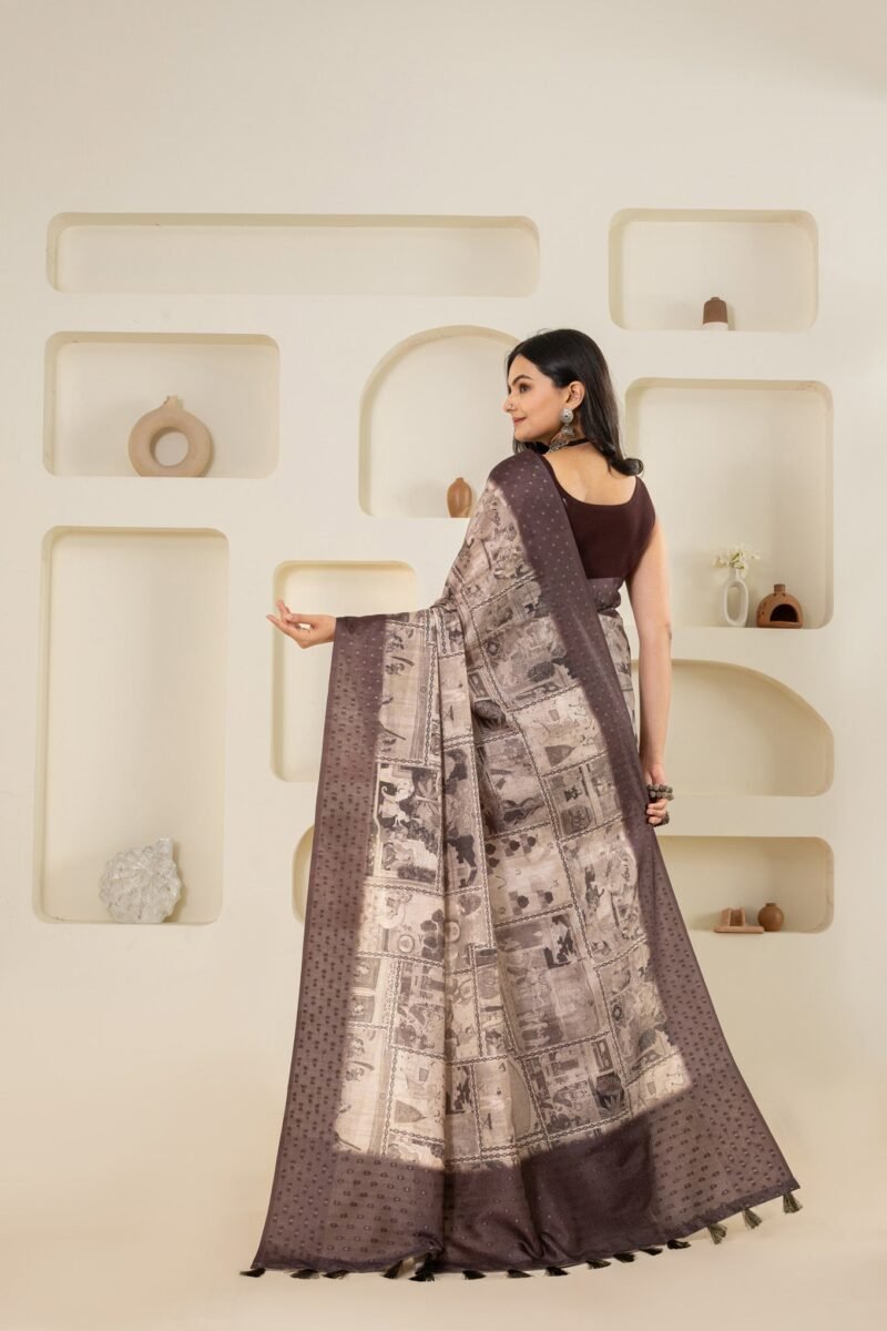 Step into elegance with this striking black and white beige saree, a masterpiece featuring a blend of traditional Pichwai and Mughal-inspired prints. The saree is adorned with intricate block prints that add depth and a touch of classic charm. Perfect for evening events, festive occasions, and cultural celebrations, this saree combines the timeless appeal of heritage art with a modern color palette. Crafted from high-quality fabric, it offers both sophistication and comfort, making it an ideal choice for those who appreciate the beauty of traditional prints with a contemporary twist.