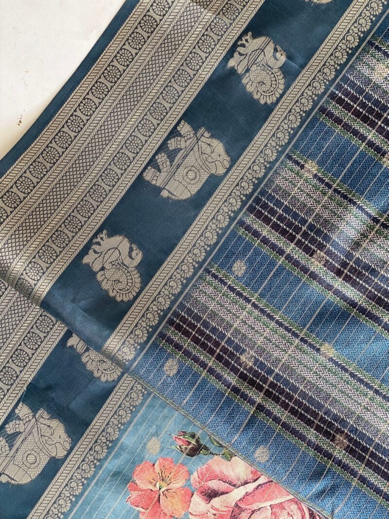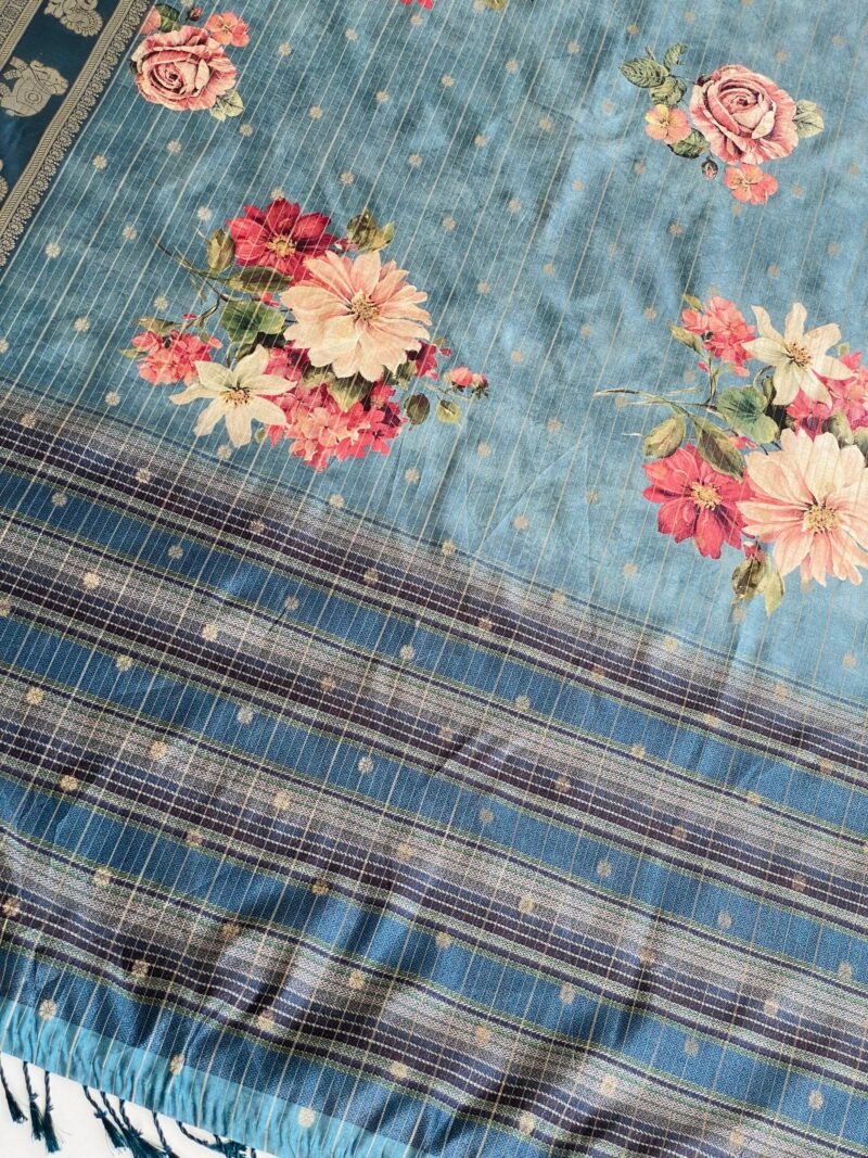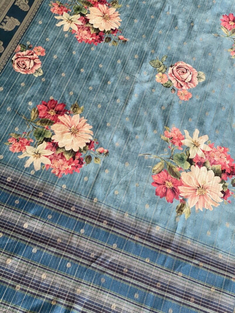 This beautiful blue saree features a delicate floral print all over the body, creating a serene and elegant look. The soft fabric is easy to drape and gives a graceful fall, making it perfect for any occasion. The saree is designed with a zari border and checks, adding a touch of traditional charm to the modern floral design. Made from semi-tussar silk, this saree is lightweight, non-transparent, and comfortable to wear throughout the day.