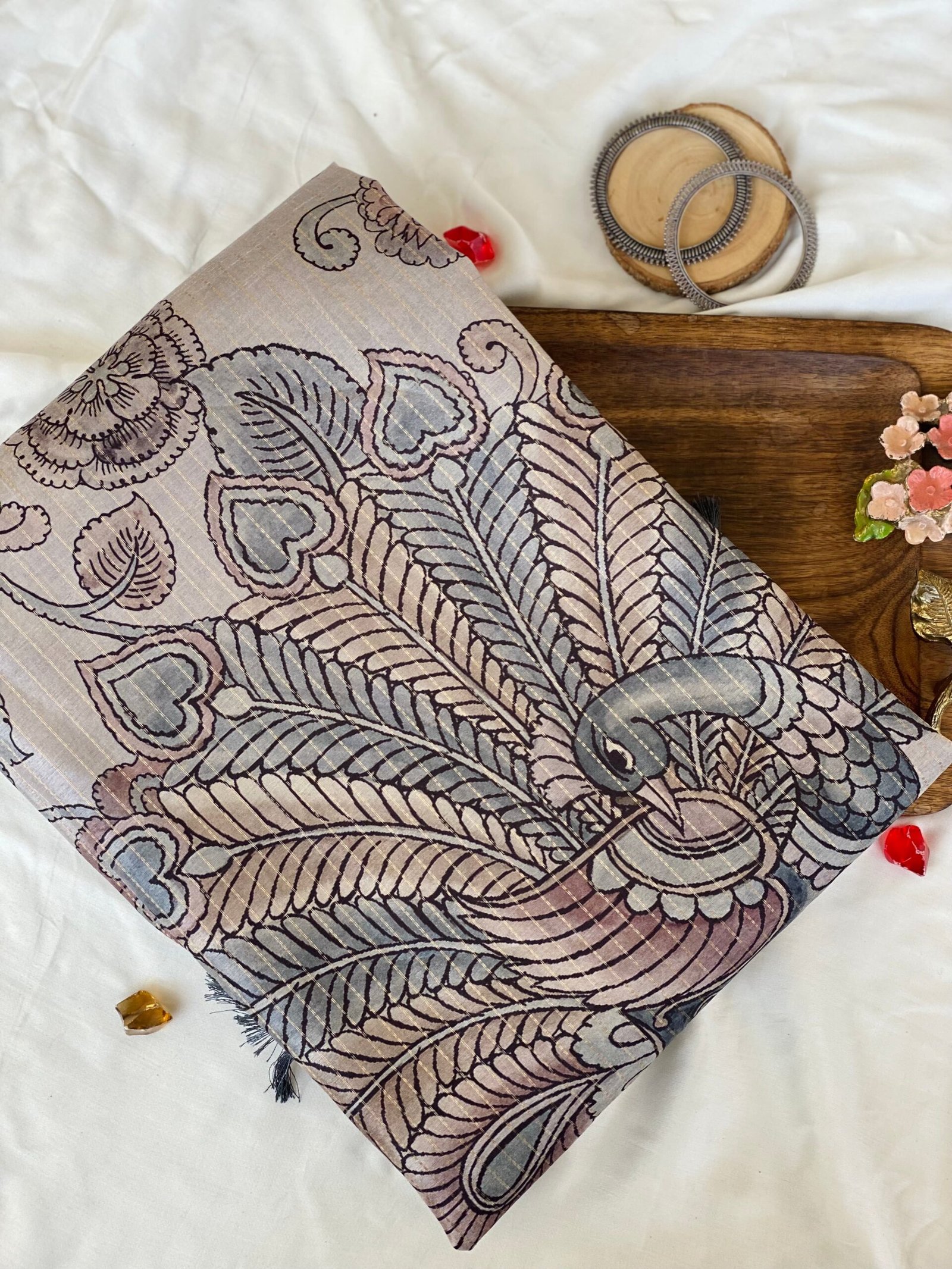 Be the first to review “Enchanting Peacock Kalamkari Saree with Charms”