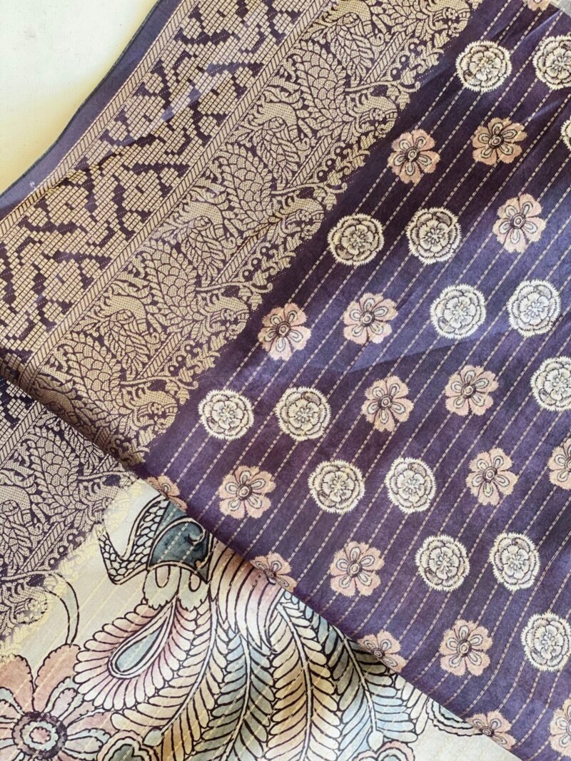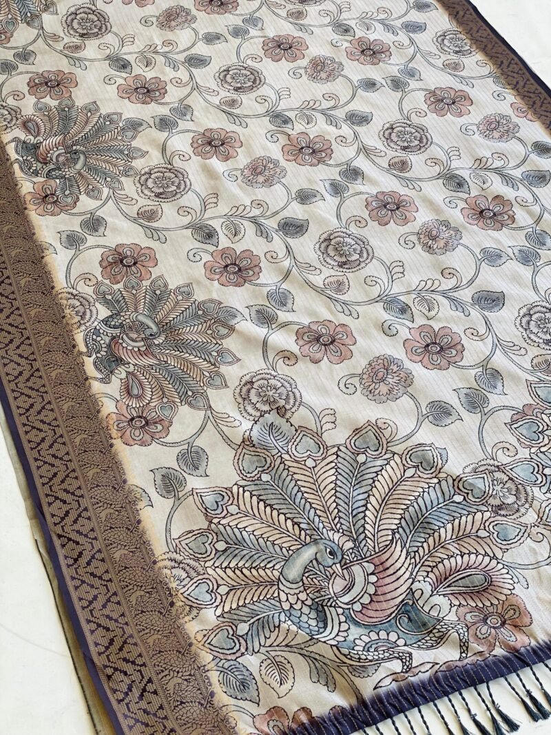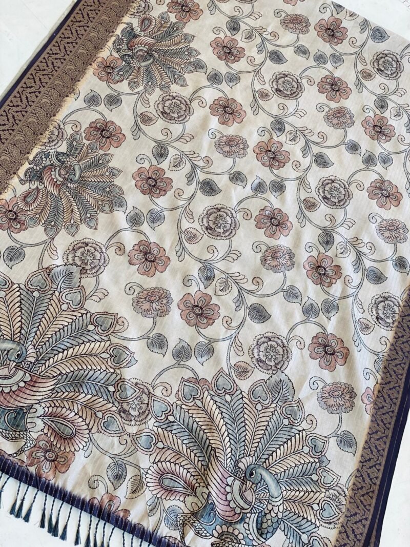 This exquisite Semi-Tussar silk saree features a mesmerizing Kalamkari print all over the body, adding a rich, traditional charm to your look. The pallu is adorned with a stunning peacock print, symbolizing grace and beauty. With its soft and easy-to-drape fabric, this saree offers both comfort and elegance, perfect for festive occasions or special gatherings. The zari border enhances the overall look, giving it a luxurious finish. Whether you’re attending a wedding, a cultural event, or any special celebration, this saree is sure to make a statement.