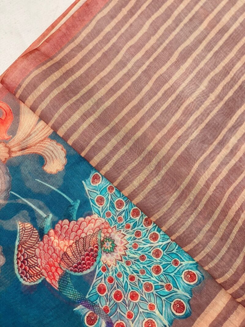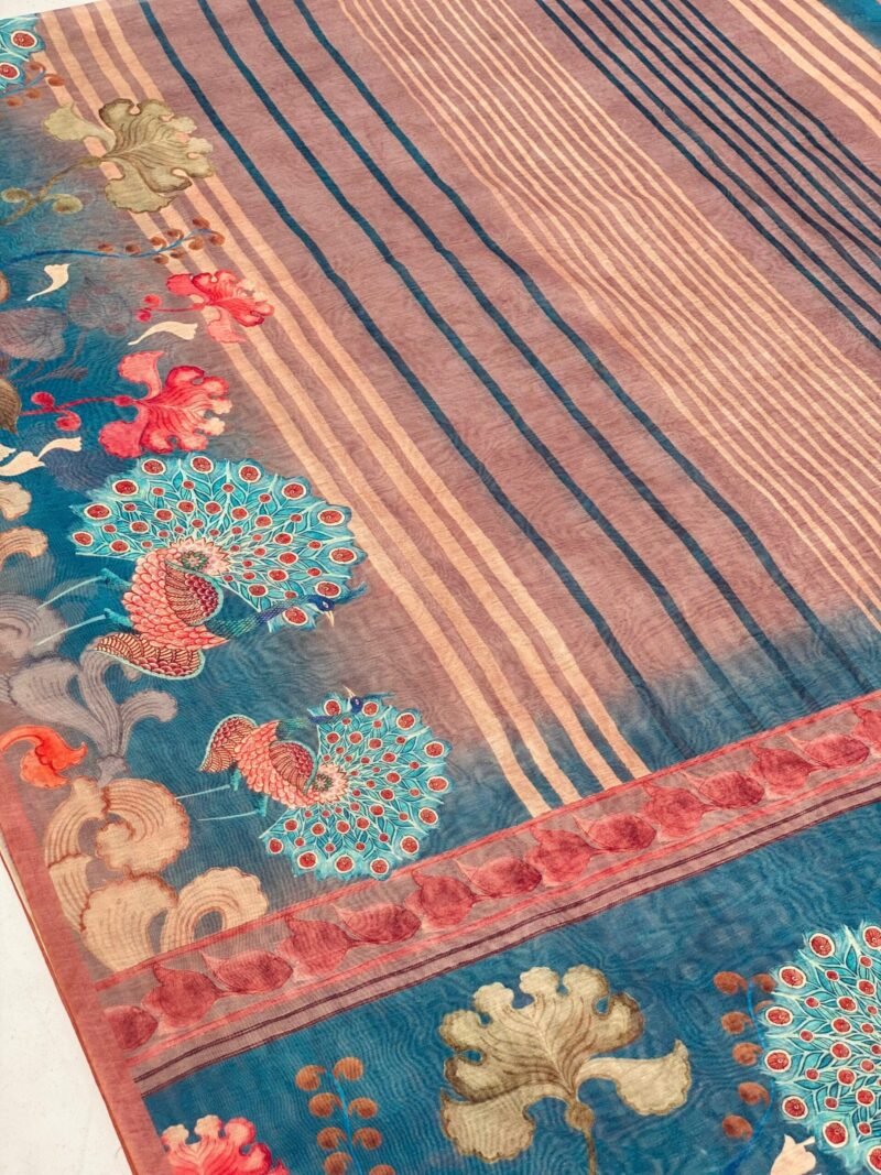Experience the beauty of this Chanderi cotton saree! It features a stunning peacock design on the pallu and stylish lining prints on the body. Perfect for adding elegance to any occasion! it comes with an unstitched blouse.