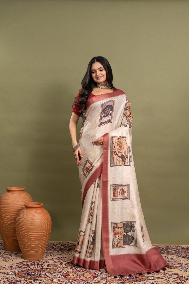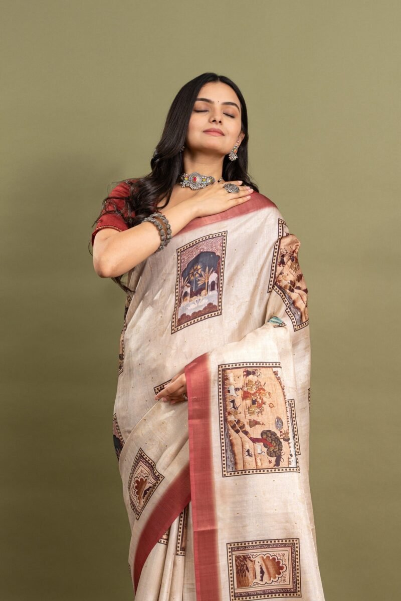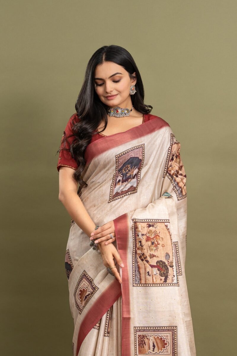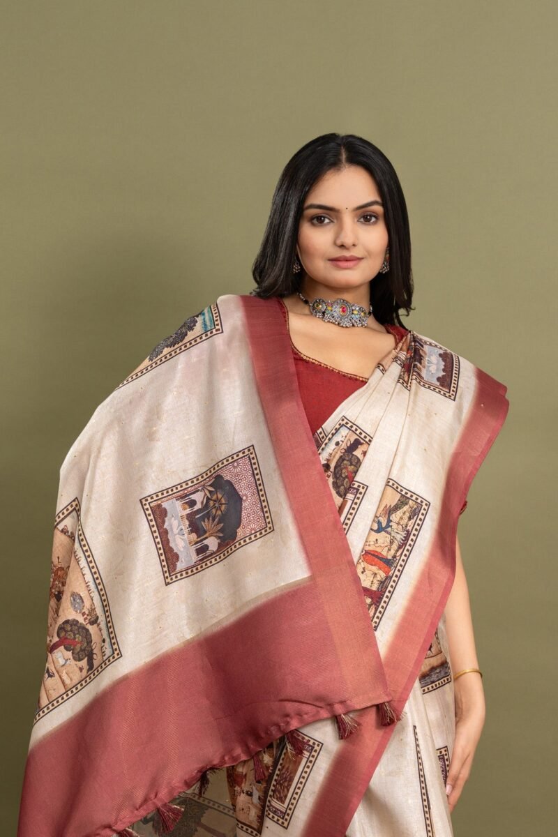 This off-white beige saree is perfect for anyone who loves a simple yet beautiful look. It has soft block prints covering the whole saree, giving it a classic and timeless style. The bold red border adds a pop of color, making it stand out. Made from comfortable, high-quality fabric, this saree drapes well and feels great to wear. Whether it’s a festival, wedding, or family gathering, this saree is a wonderful choice that mixes tradition with a modern touch.