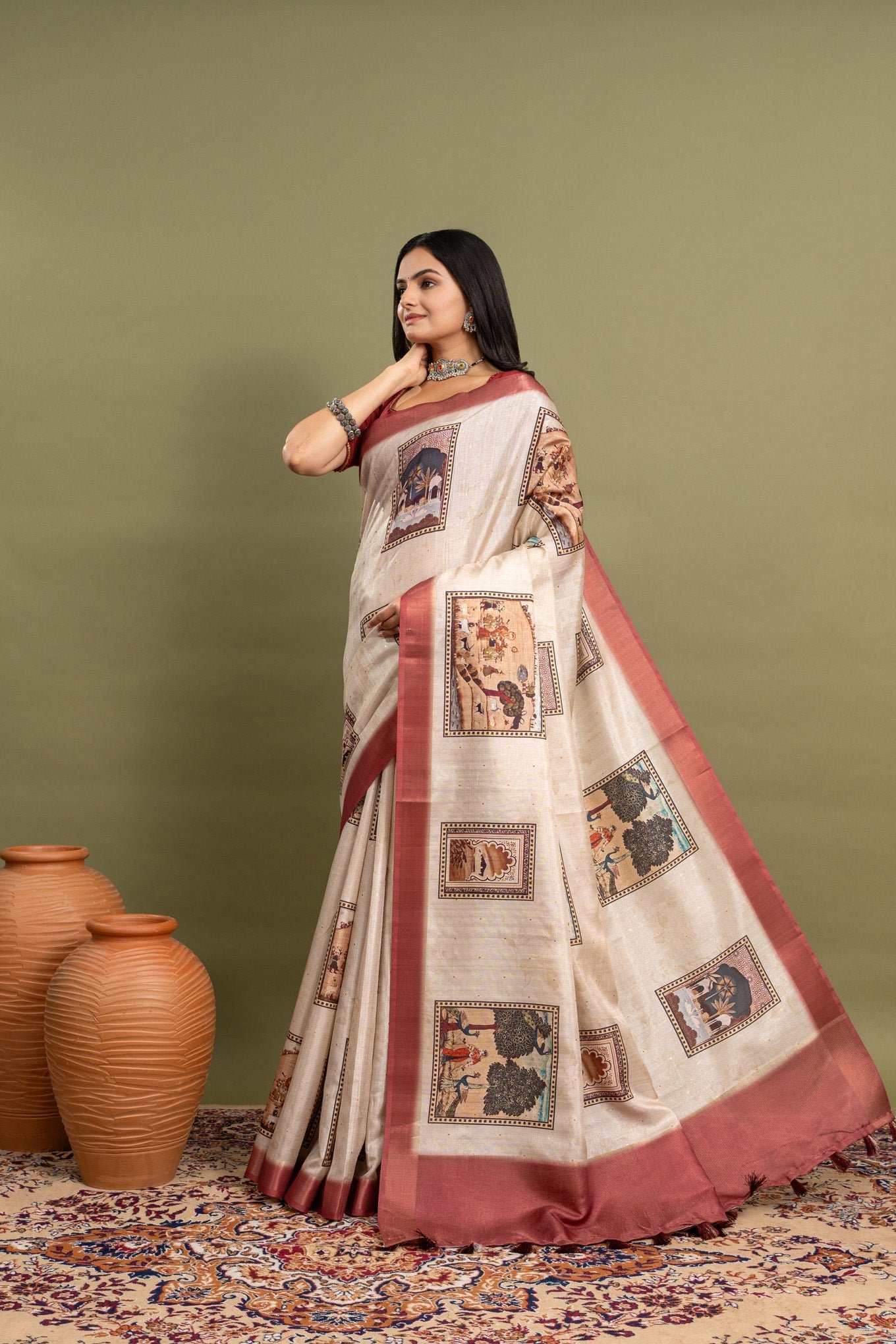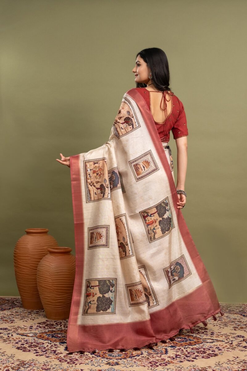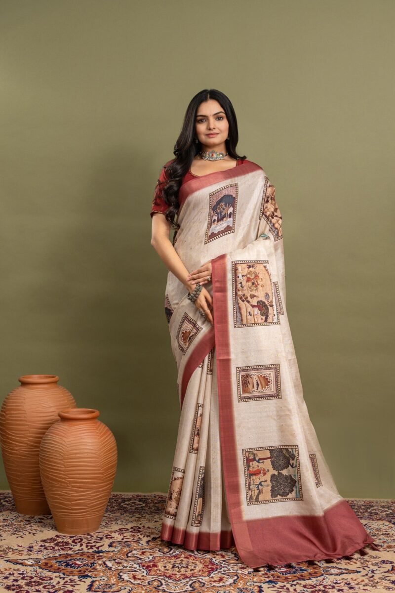 This off-white beige saree is perfect for anyone who loves a simple yet beautiful look. It has soft block prints covering the whole saree, giving it a classic and timeless style. The bold red border adds a pop of color, making it stand out. Made from comfortable, high-quality fabric, this saree drapes well and feels great to wear. Whether it’s a festival, wedding, or family gathering, this saree is a wonderful choice that mixes tradition with a modern touch.