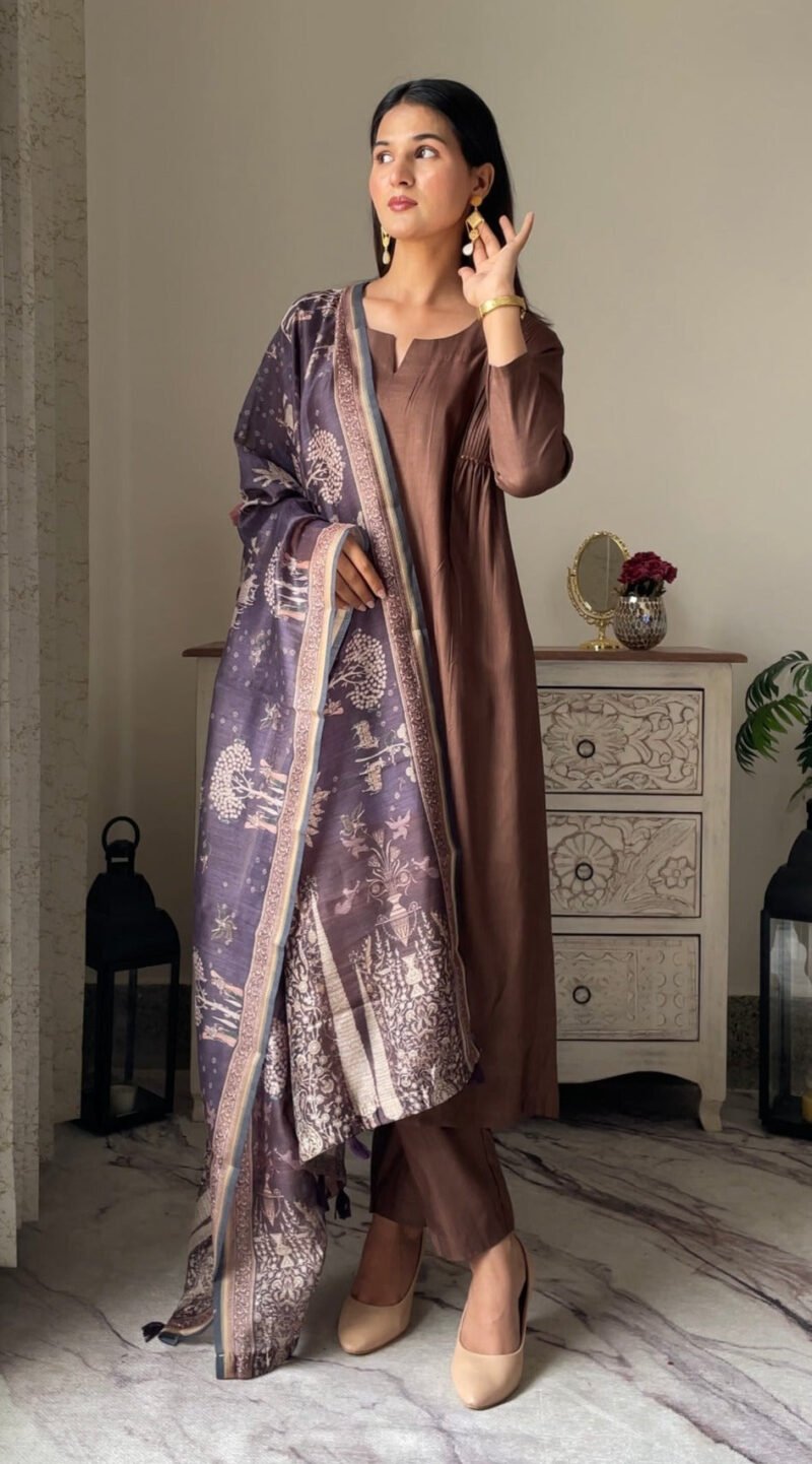 400-sale, art:fusion, art:kalamkari, beautiful suit set, best seller, Bhagalpuri Suit Set, color:brown, color:purple, designer suit, enghar343, favourite suit, festive suit, kalamkari suit, not for sale, pure bhagalpuri, salwar suit, soild suit, solid suit, solid suit set, suit, suit set, suit sets, three piece set, three piece suit