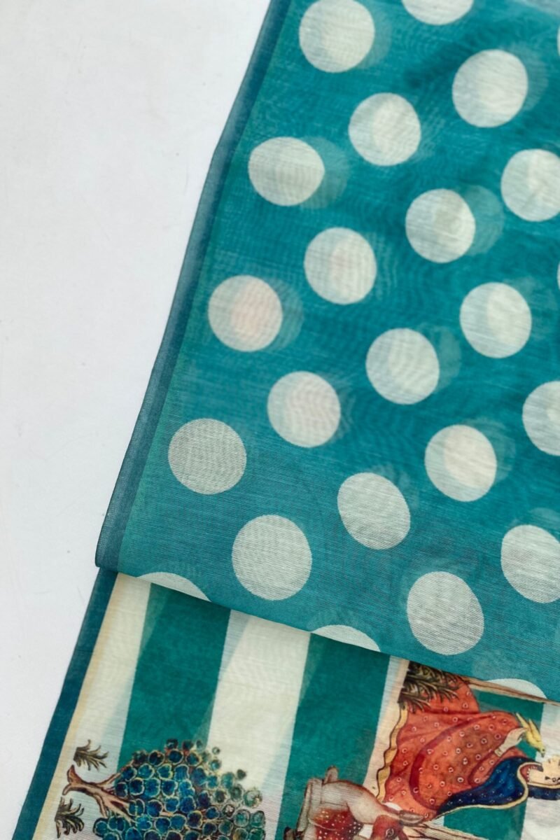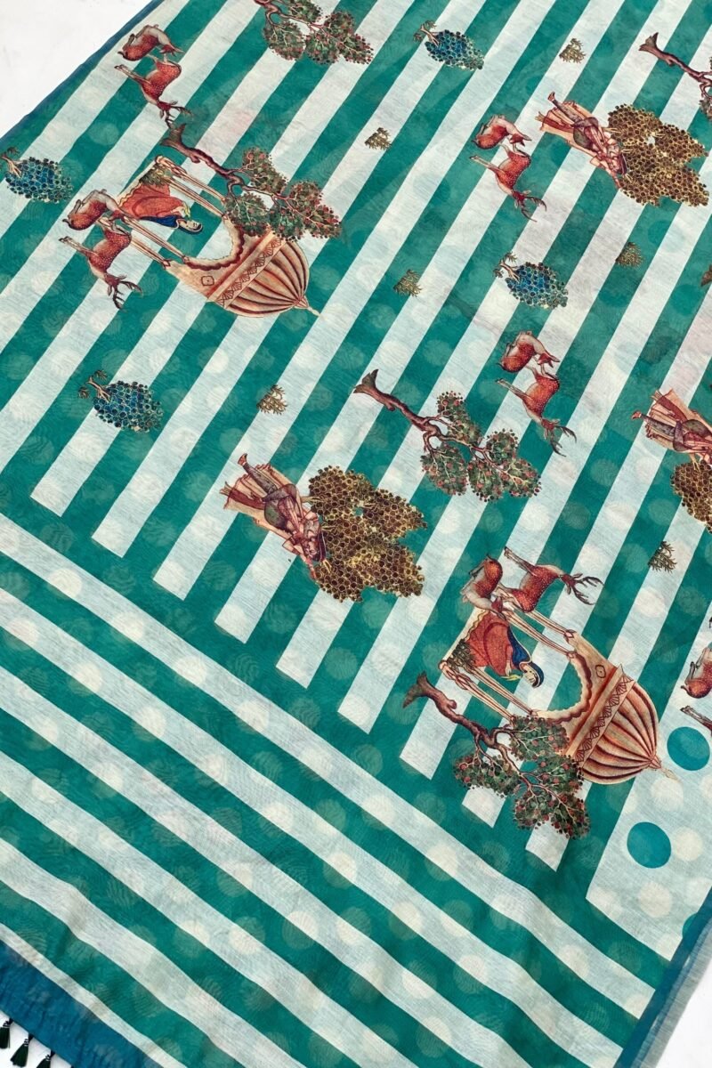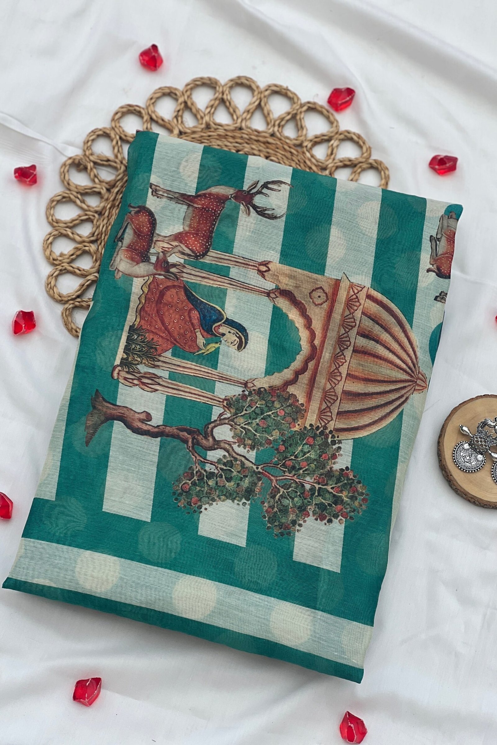 Discover our beautiful Rama stripe print saree! It features a lovely design with a lady sitting in a beautiful place, accompanied by a bird, with deer and trees in the background. The saree comes with an unstitched polka dot print blouse.