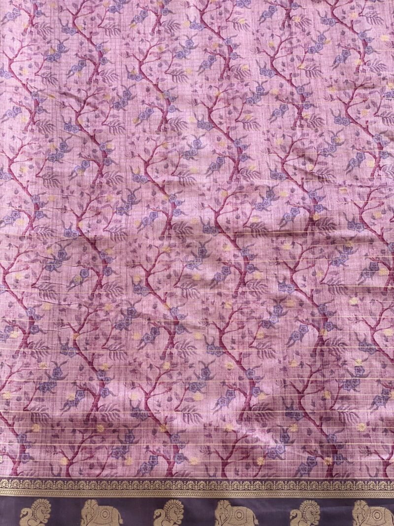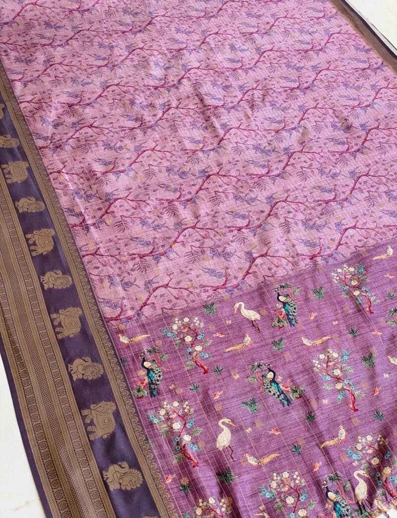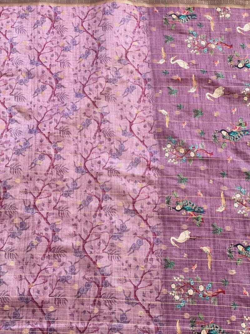 Add a touch of grace to your wardrobe with this beautiful lavender saree featuring intricate Pichwai prints. The saree showcases elegant flamingos and peacocks on the pallu, making it a perfect blend of traditional art and modern charm. Crafted from soft Semi-Tussar silk, it drapes effortlessly, offers a good fall, and is non-transparent for added comfort. The zari border with subtle checks adds a refined finish, making this saree ideal for festive occasions, weddings, or cultural gatherings.